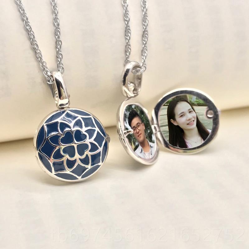 新款原创樱花圆形翻吊盖片蓝色珐琅盒s925纯银相坠女毛衣项链定制