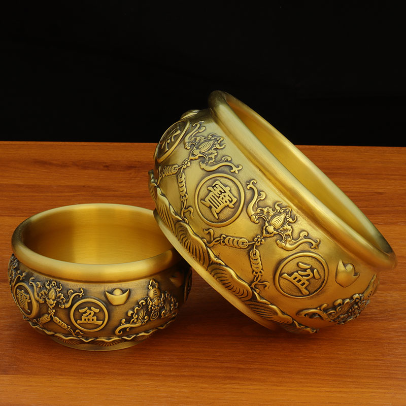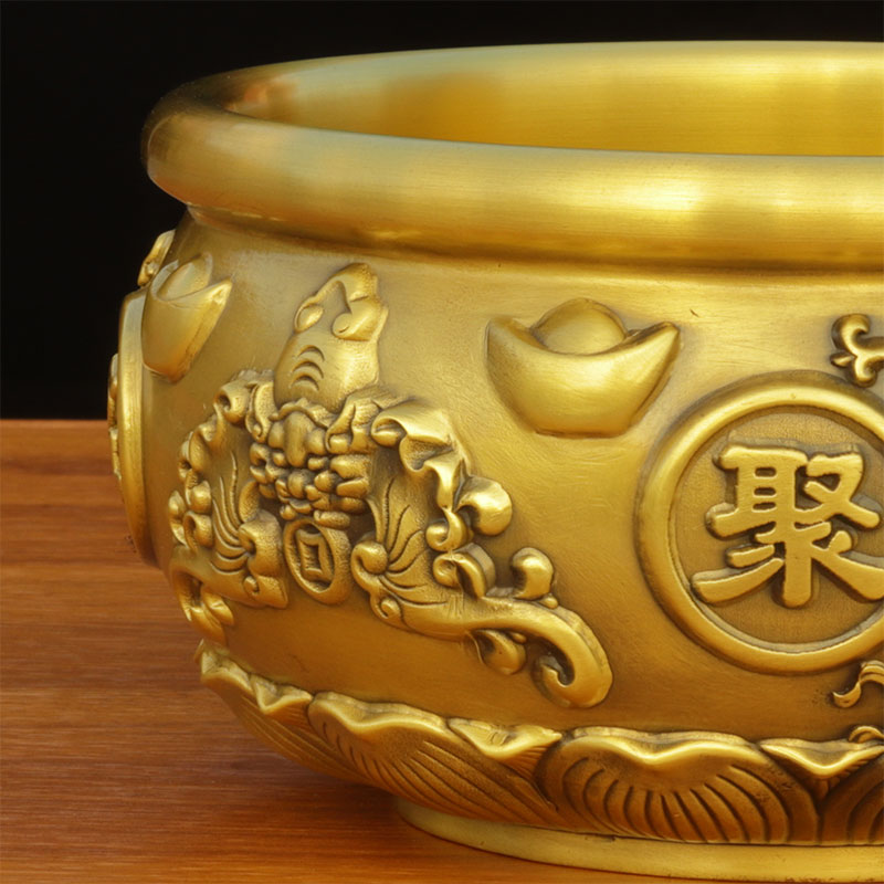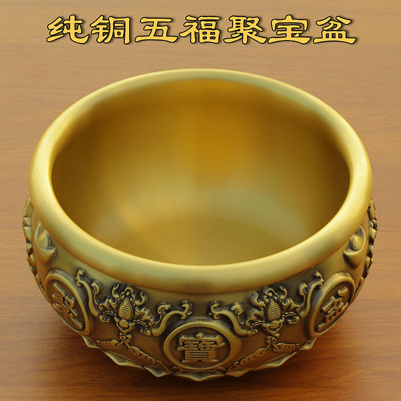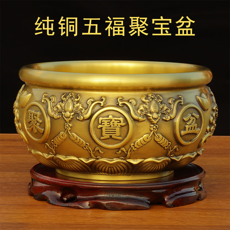 加厚纯铜实心五福聚宝盆摆件铜盆全D铜招财家居存钱罐铜缸客厅装