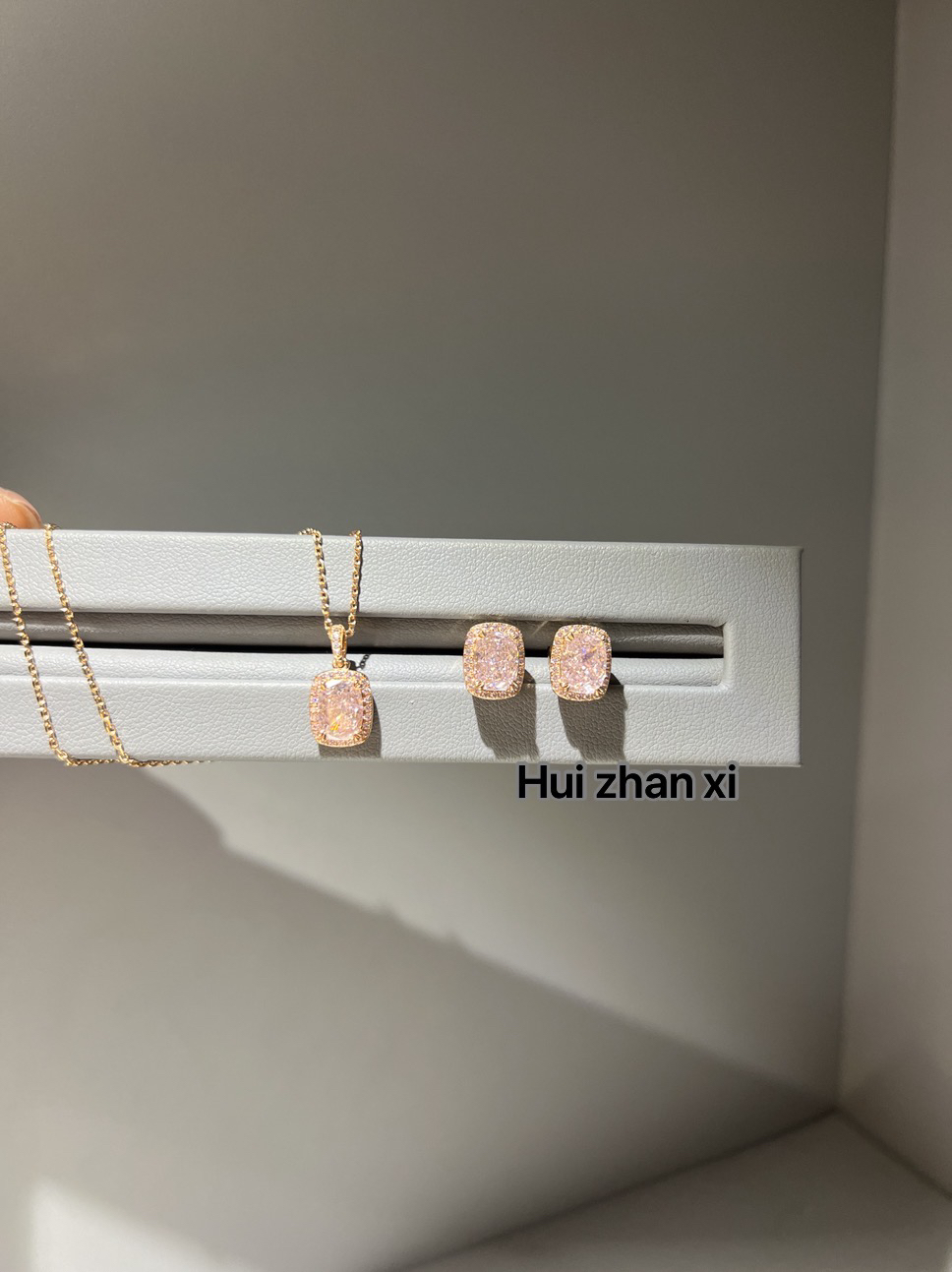 Hui zhanxi粉钻2克拉玫瑰金简单日常款耳钉 项链两件套套装
