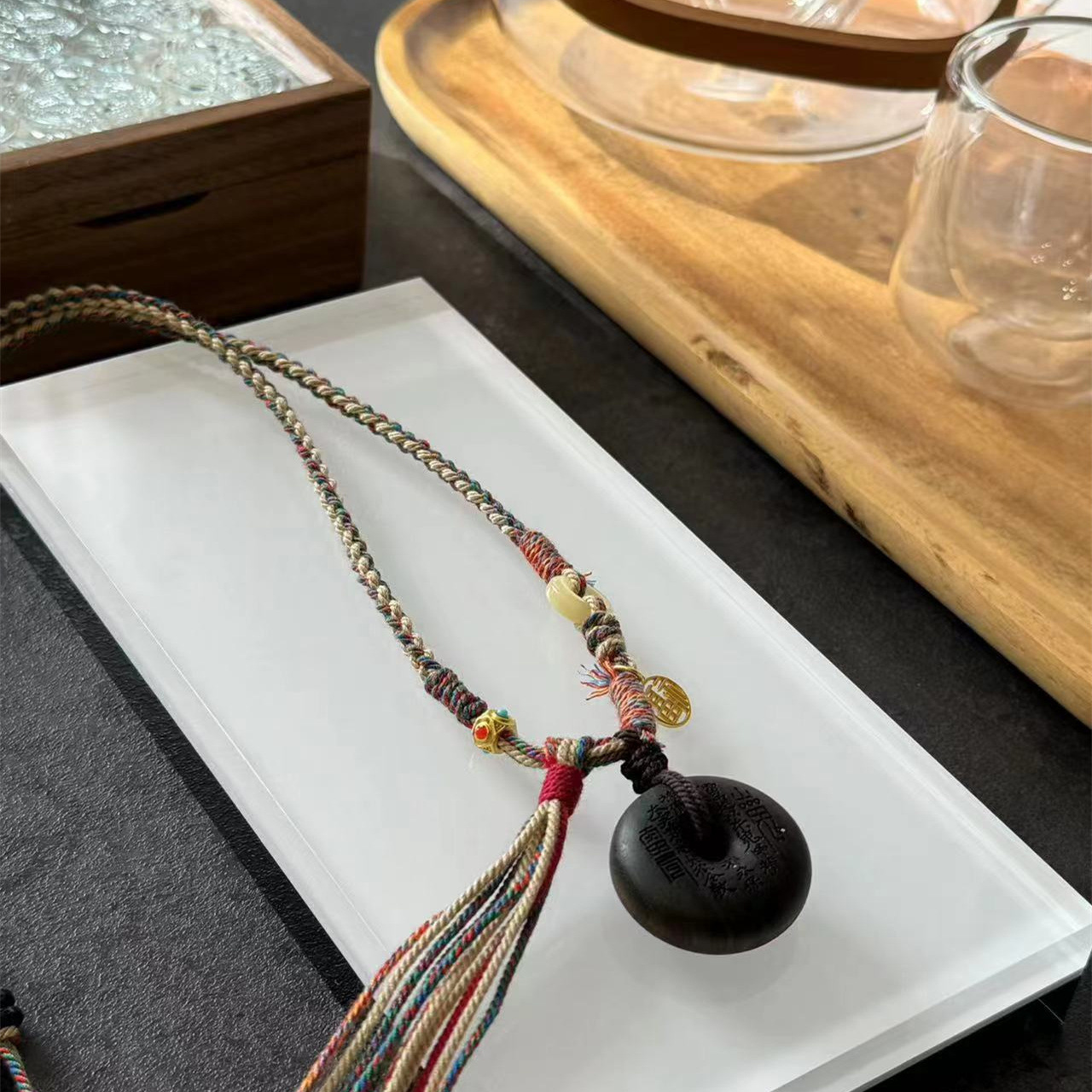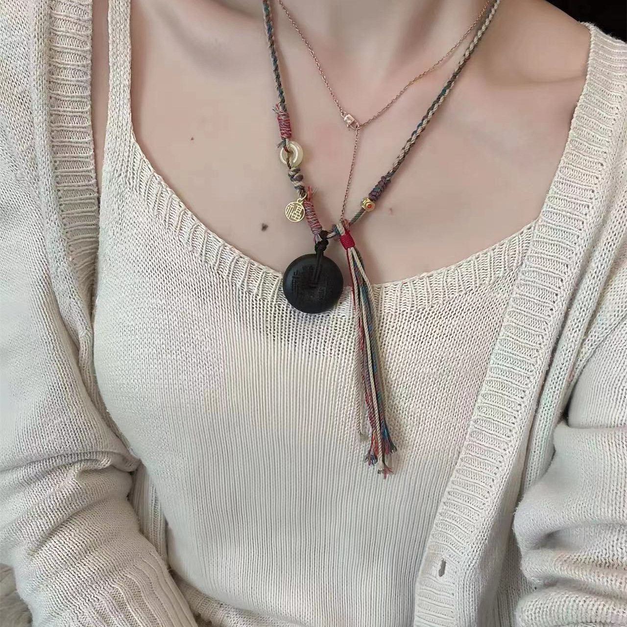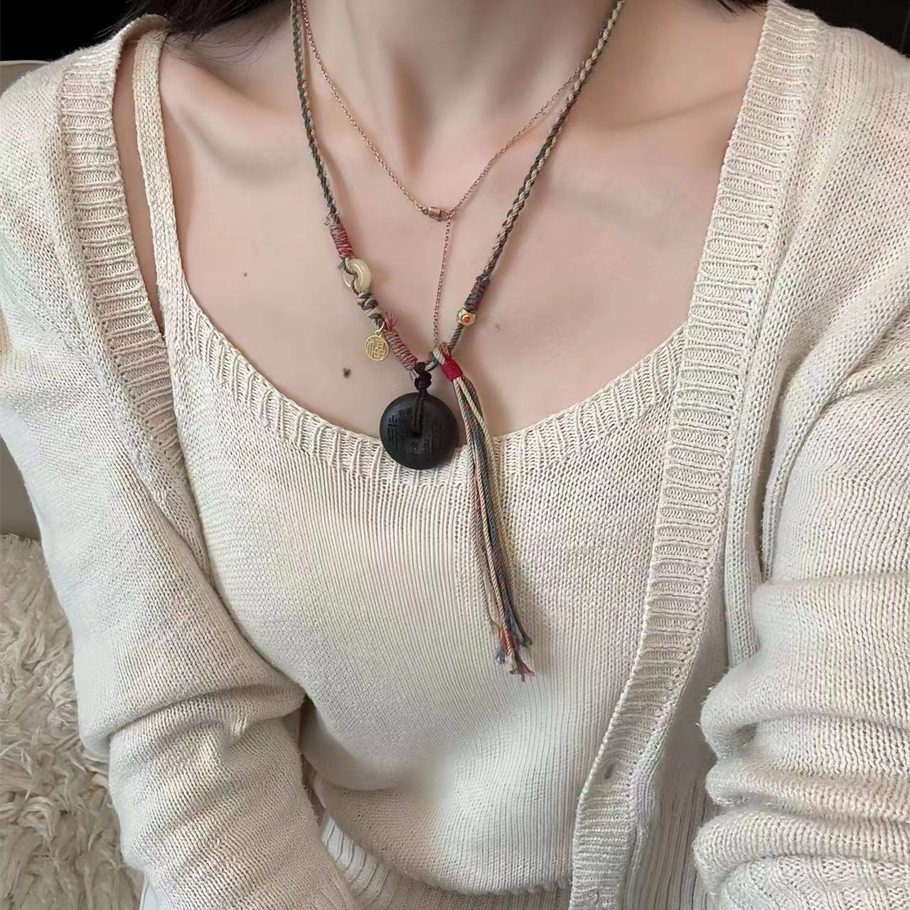 新中式山鬼花钱项链手搓棉线编织沉香平安扣编织绳吊坠项链复古小