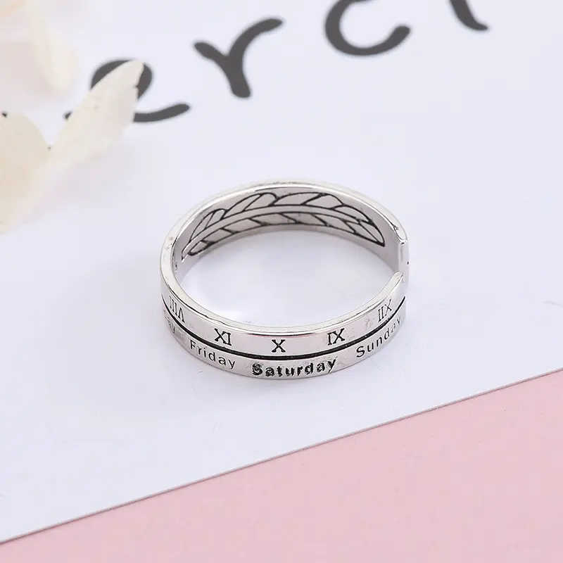 s925纯银日数字星期戒指泰银复古字母开口指环女一件