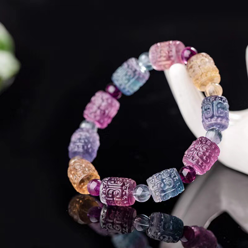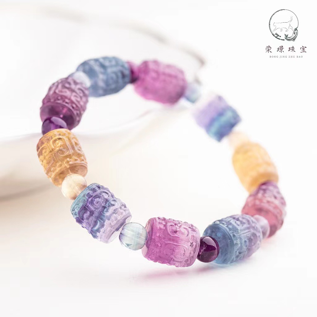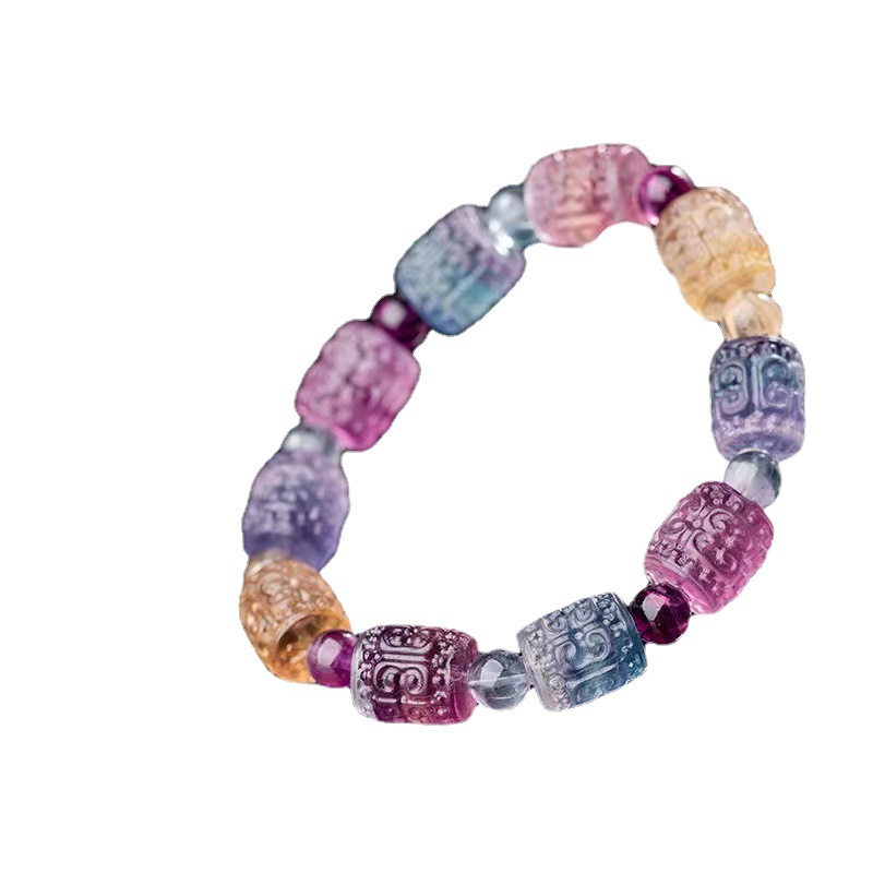 天然水晶七彩萤石回纹桶珠手串 甜美可爱糖果色雕刻回纹手链饰品
