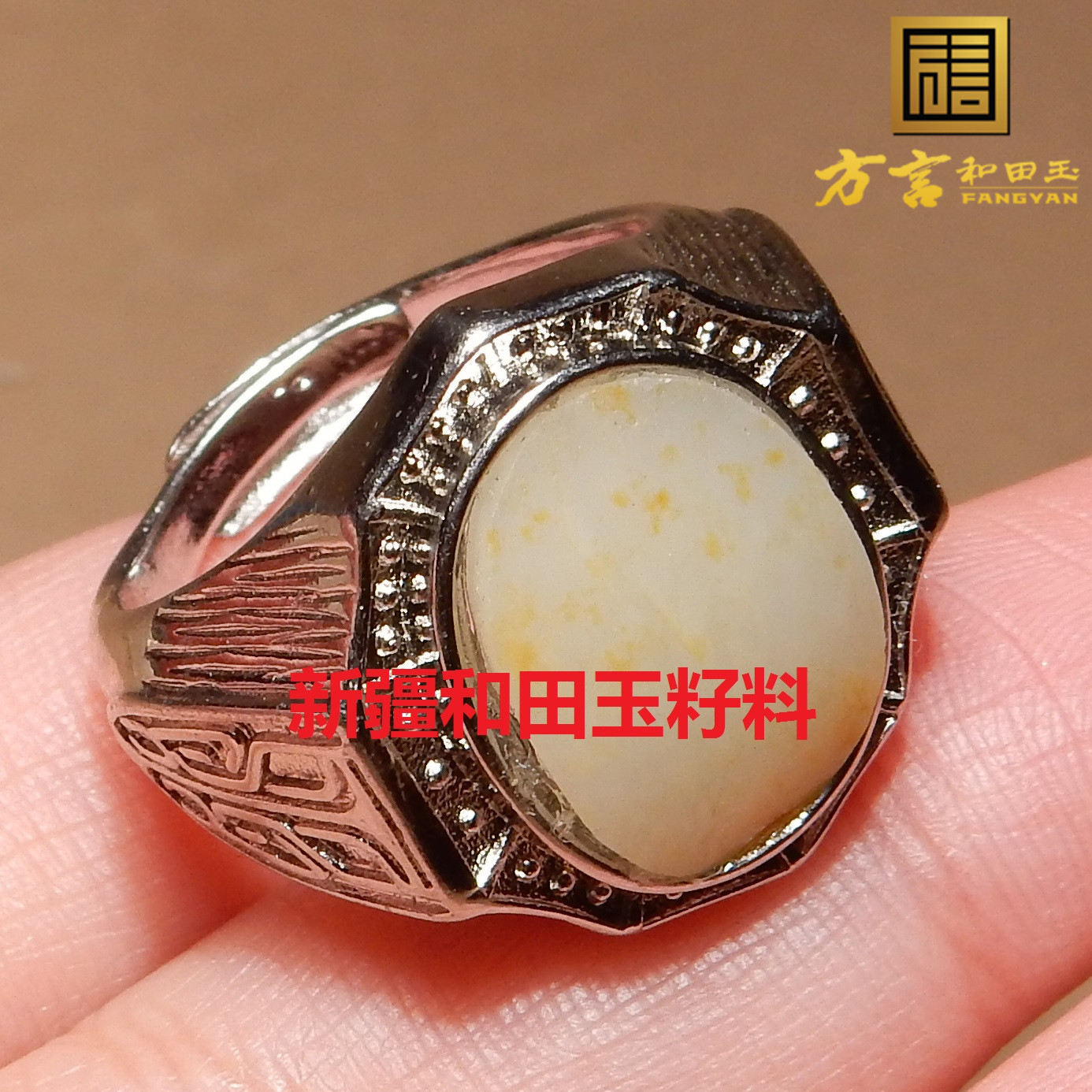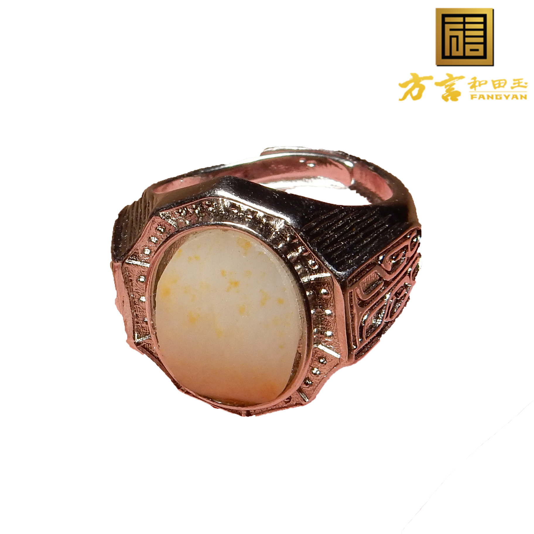 嗨翻天方言和田玉精品特色新疆洒金皮无结构白玉银镶钳戒指扳指A1