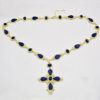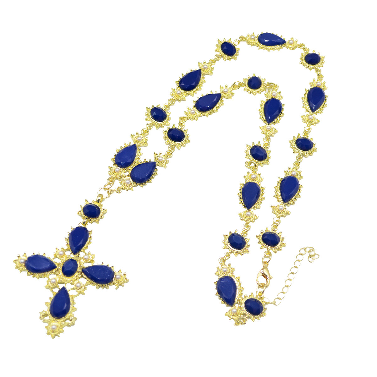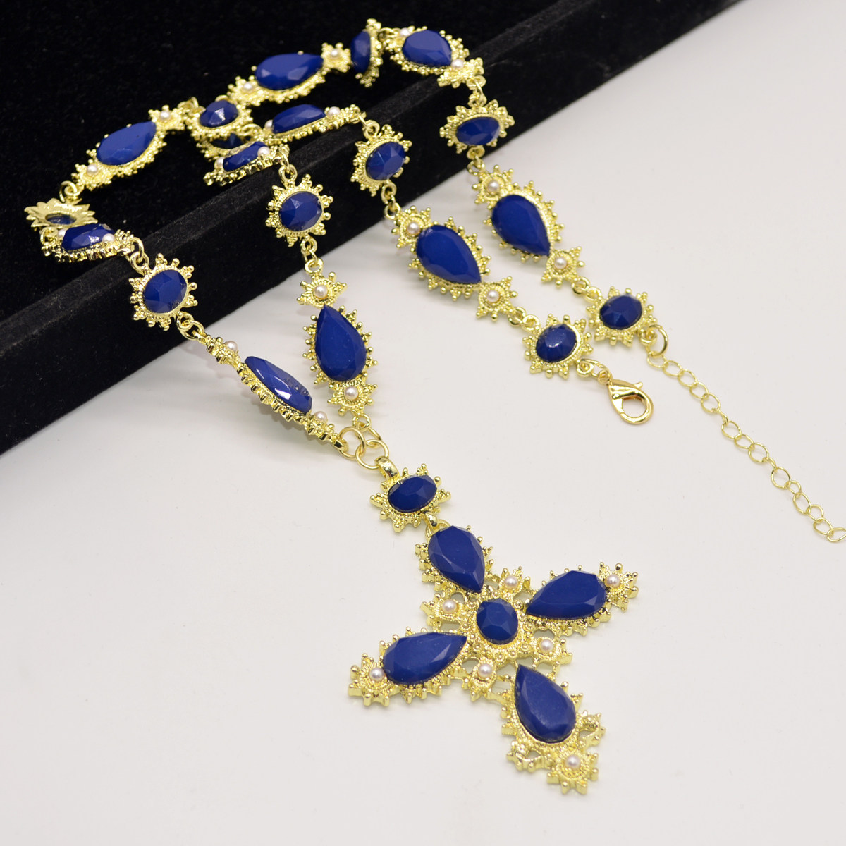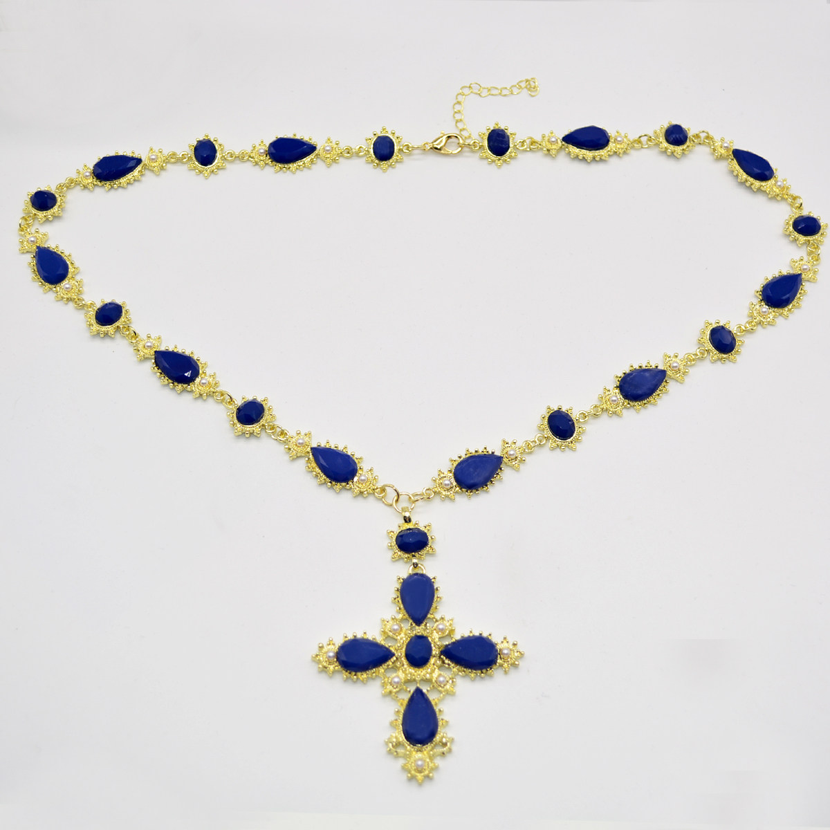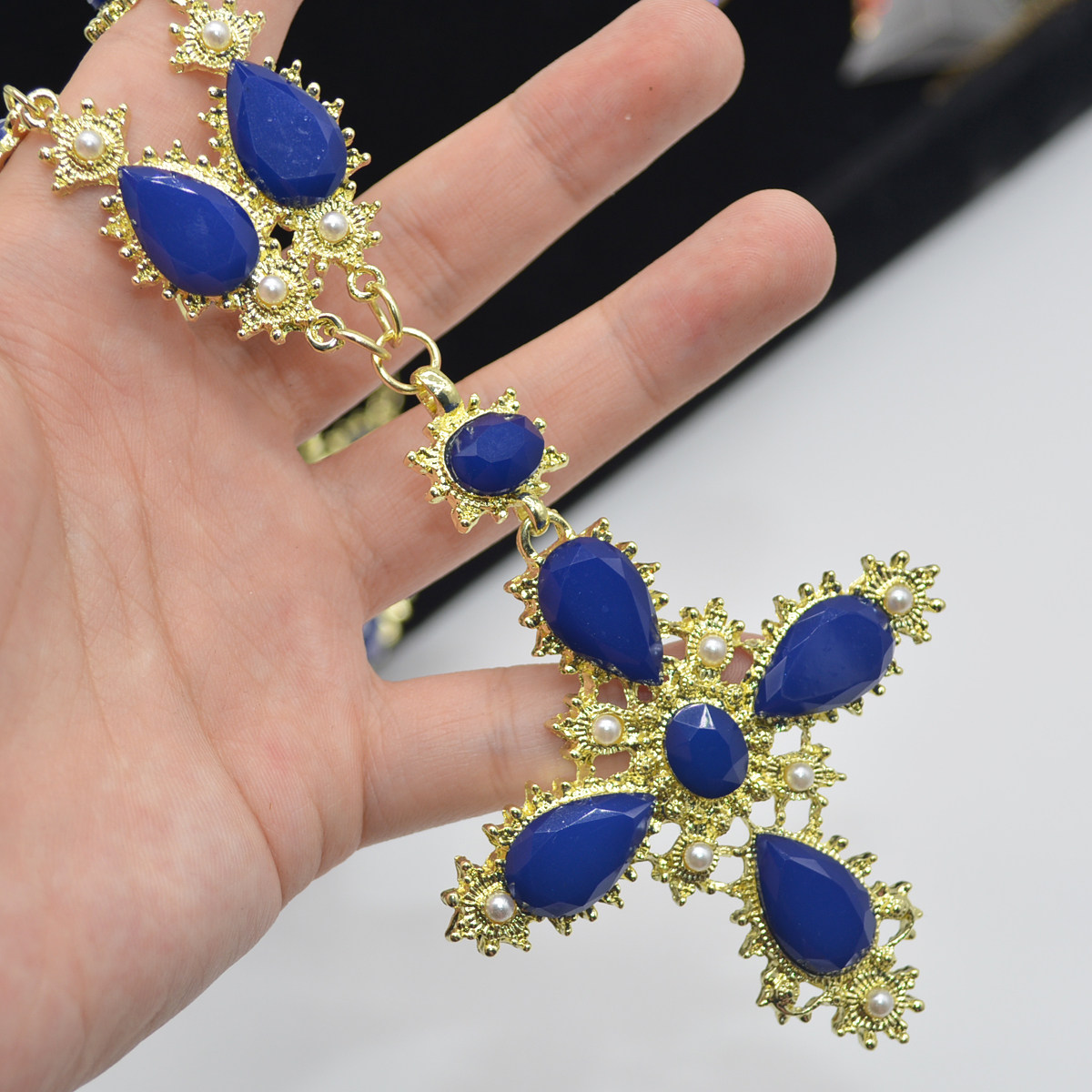 欧美夸张个性蓝色十字架吊坠项链巴洛克复古毛衣链气质长款颈链潮