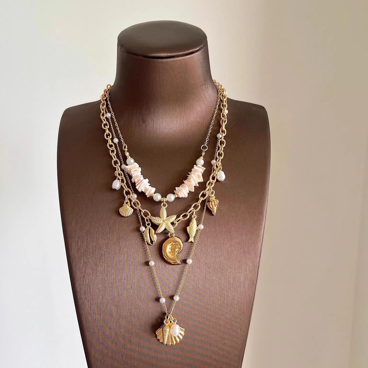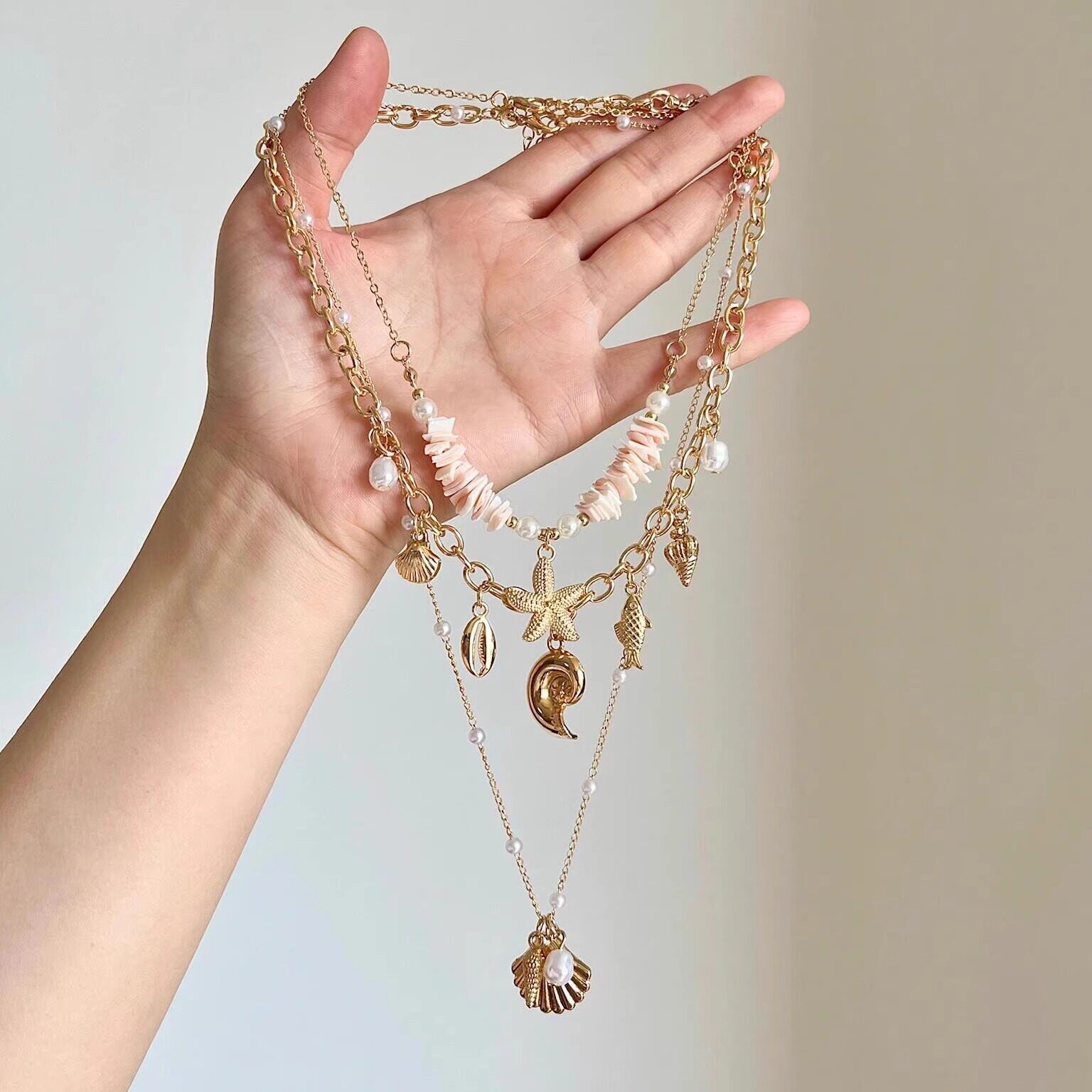 金色贝壳海星珍珠流苏项链女新款海边度假风颈链三层叠戴锁骨链潮