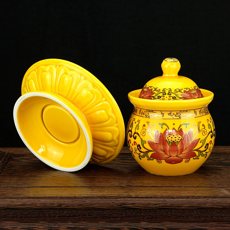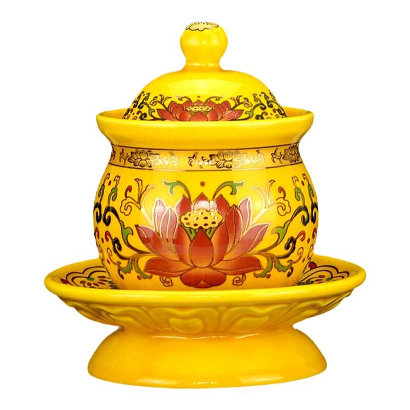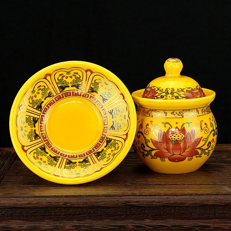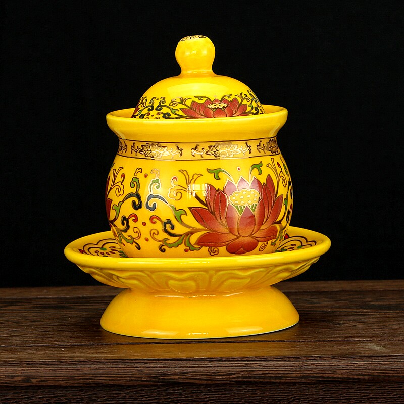 陶瓷供水杯 浮雕莲花贡杯 荷花杯 佛前供杯 黄色观音杯仙家杯摆件