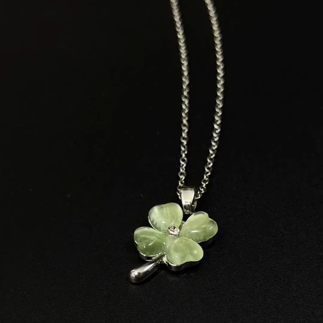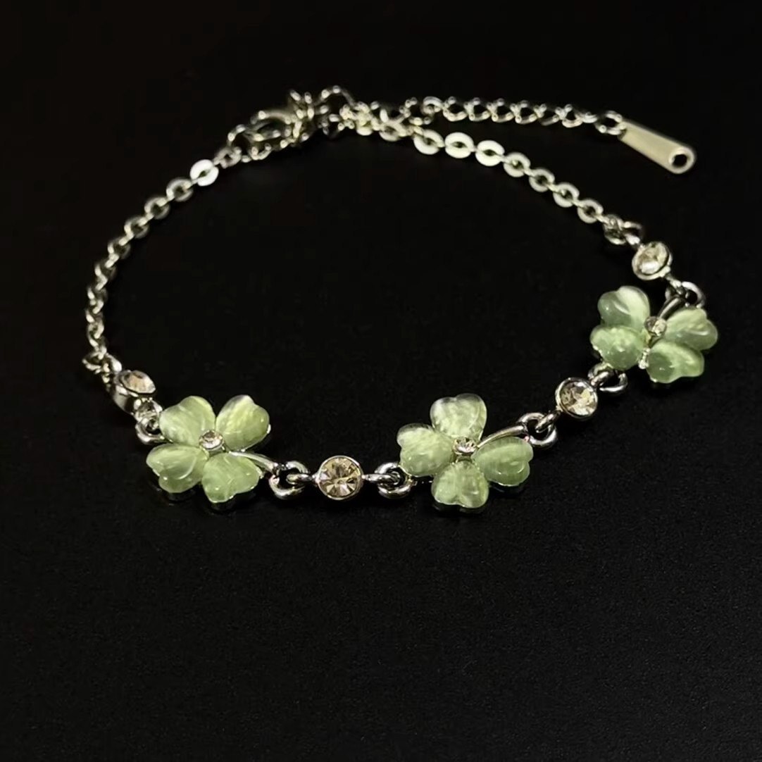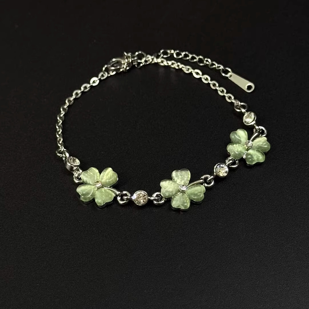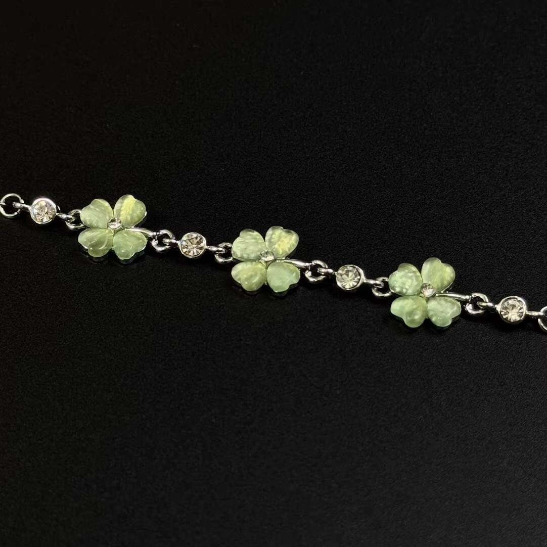 S925银森系小清新绿色四叶草手链小众设计仿猫眼石精致耳钉锁骨链