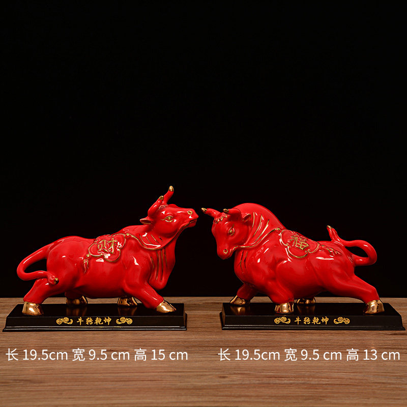 红色陶瓷牛摆件一对器财十二生肖瓷招牛饰厅家居客品