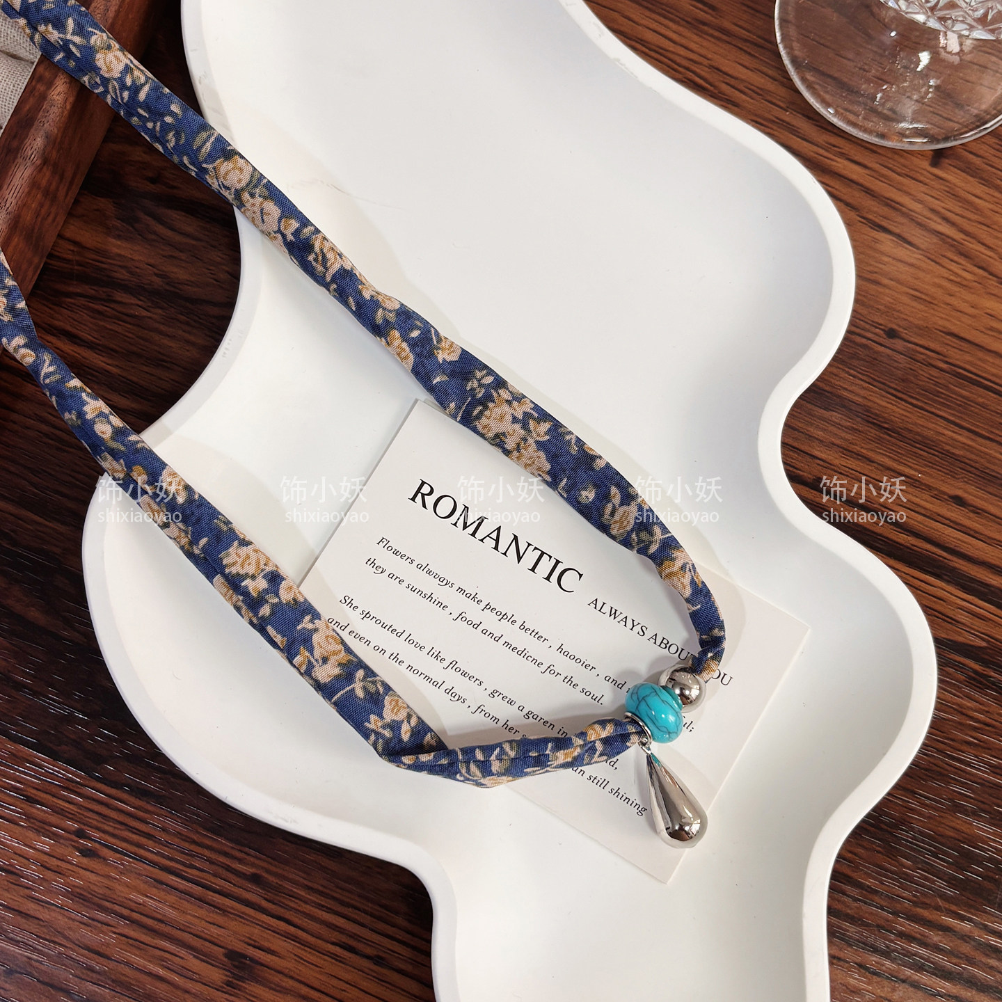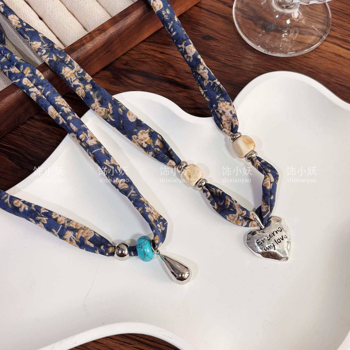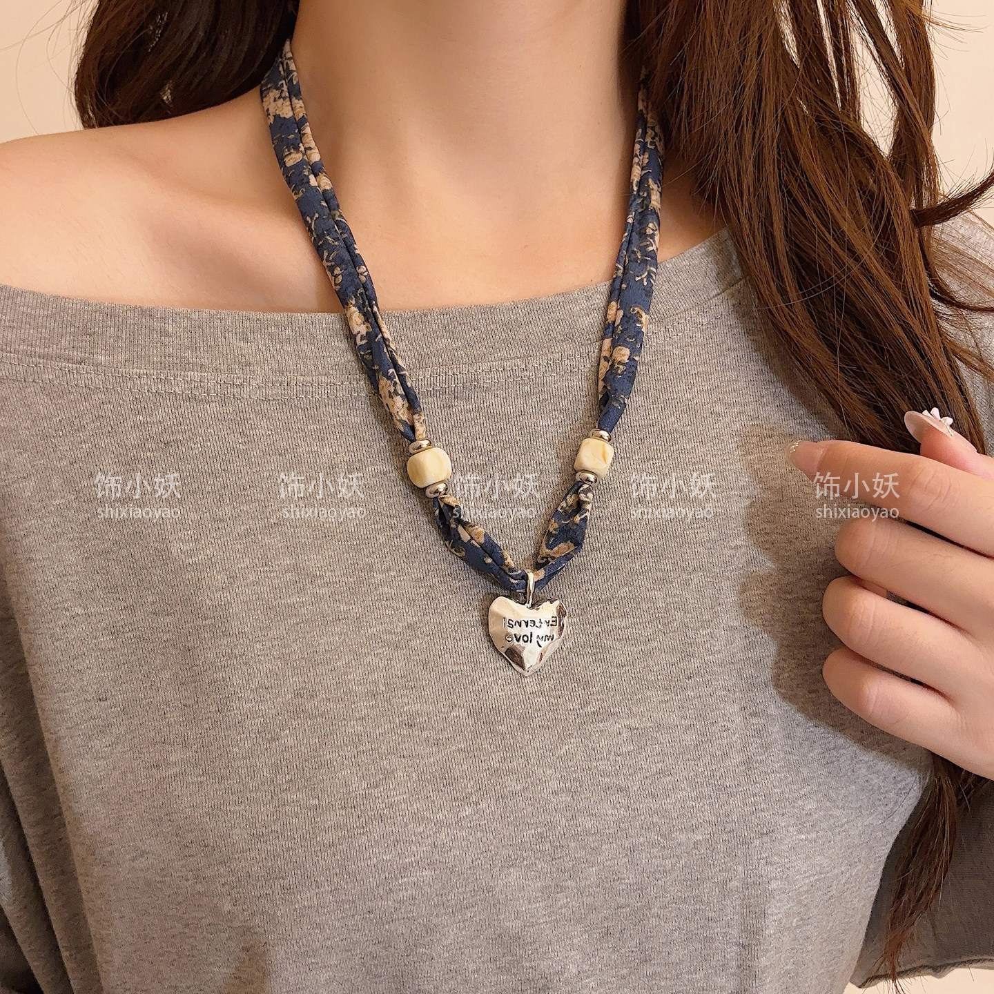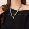 深蓝色碎花丝巾爱心水滴项链女秋冬独特设计感长款毛衣链衣服配饰