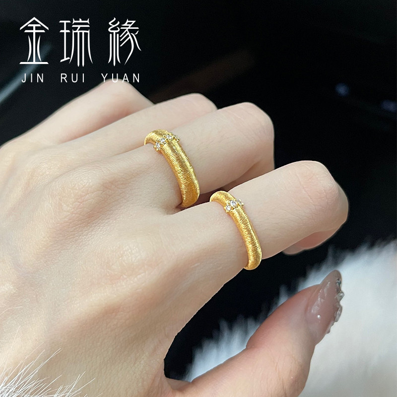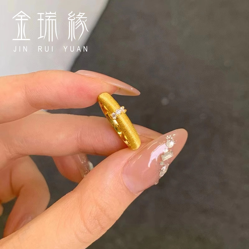 999足金绸缎点钻拉丝黄金戒指镶钻INS小香风指环食指戒送女友礼物