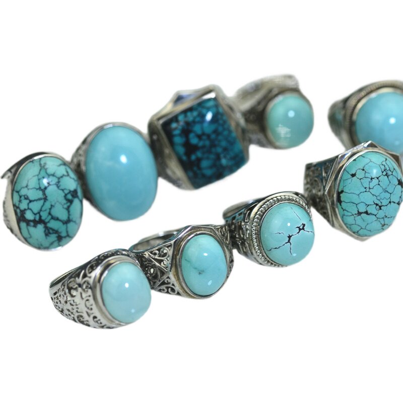 原矿天然绿松石镶嵌925银戒指指环纯银男女款方戒蛋形复古饰品diy