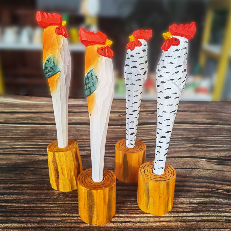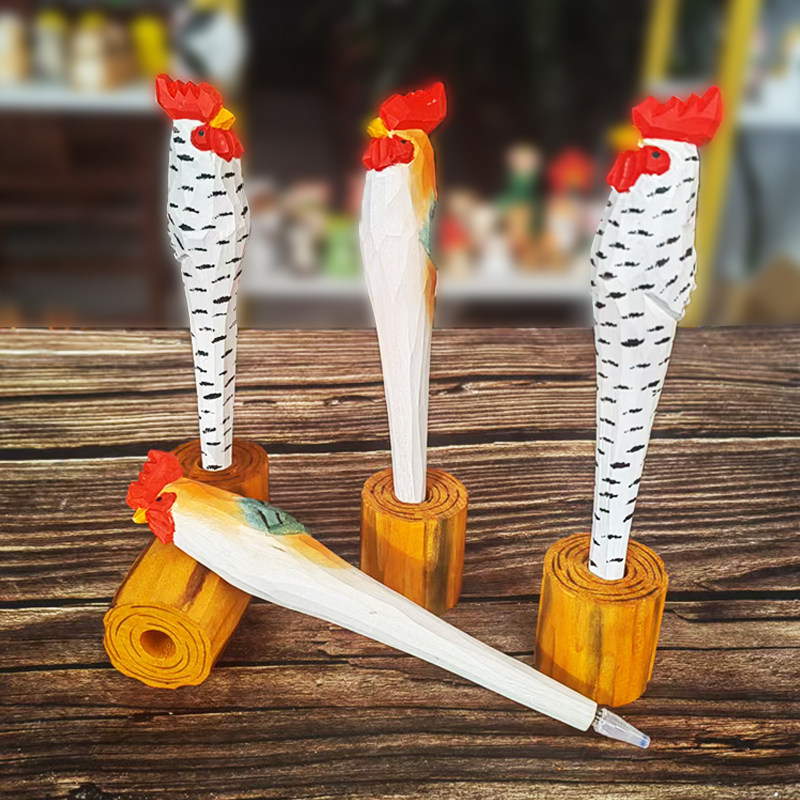 木雕摆件公鸡中性笔圆珠笔创意实木手工雕刻教师学生文具用品礼物