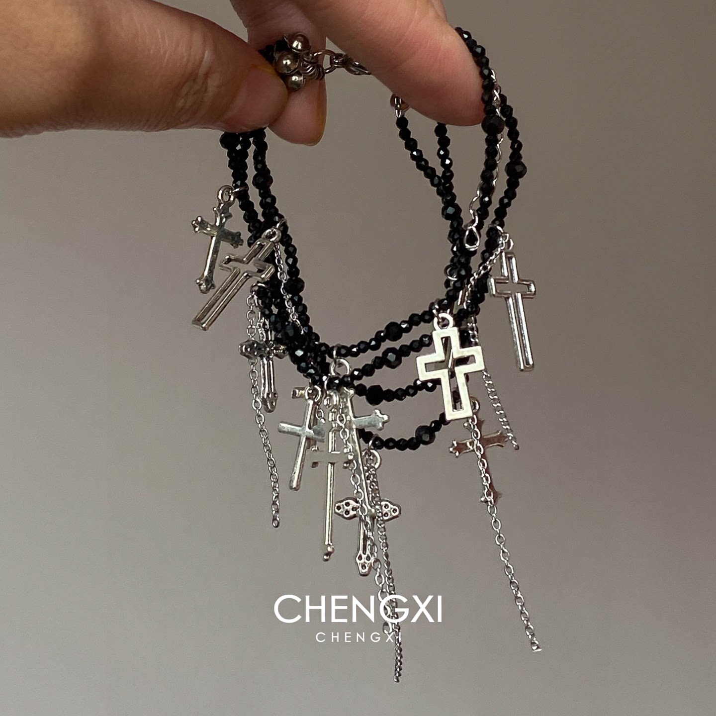 暗黑色十字架多层串珠流苏手链女款2026新款甜酷辣妹叠戴手饰配饰