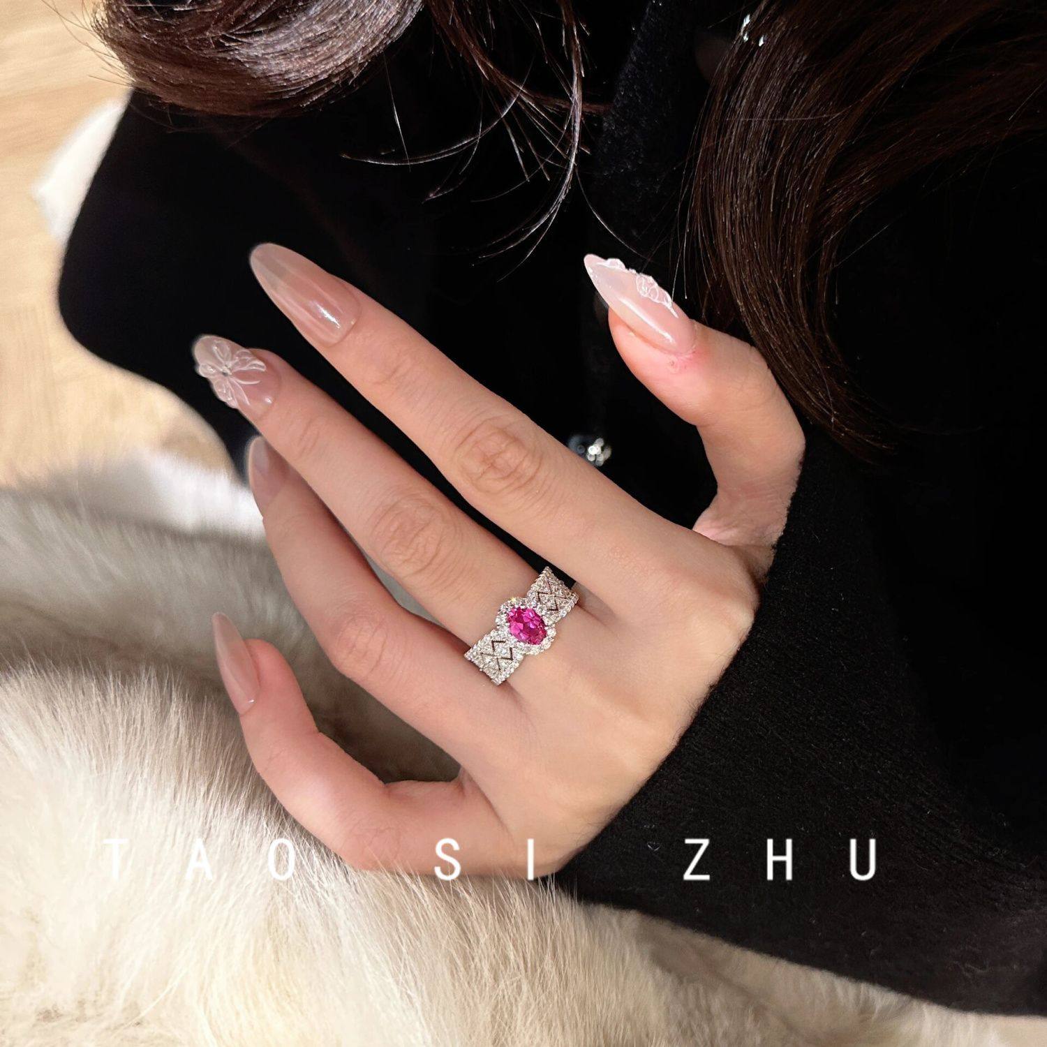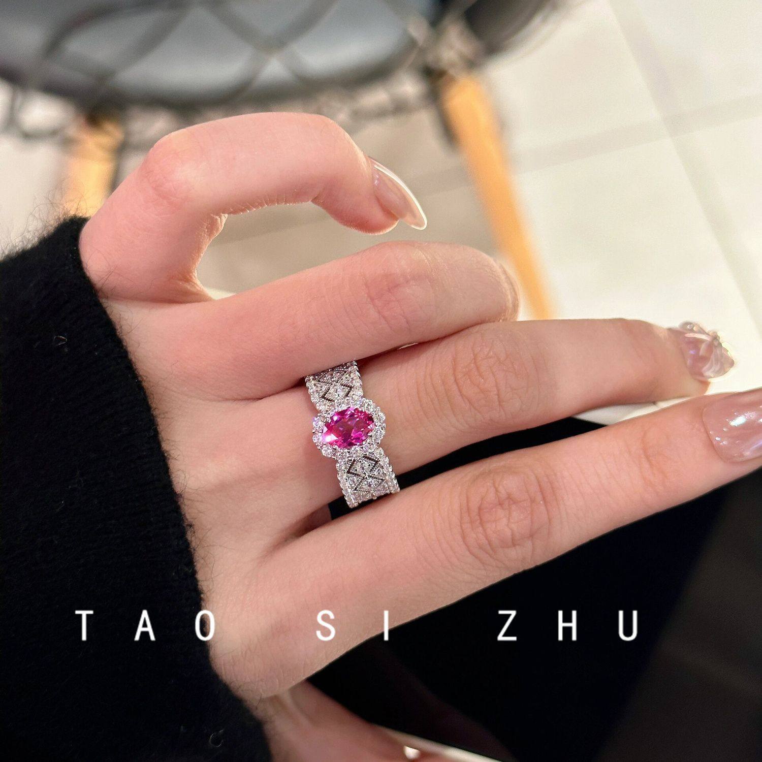 vintage中古风高级感轻奢精致定制版玫红锆石开口雕花戒指