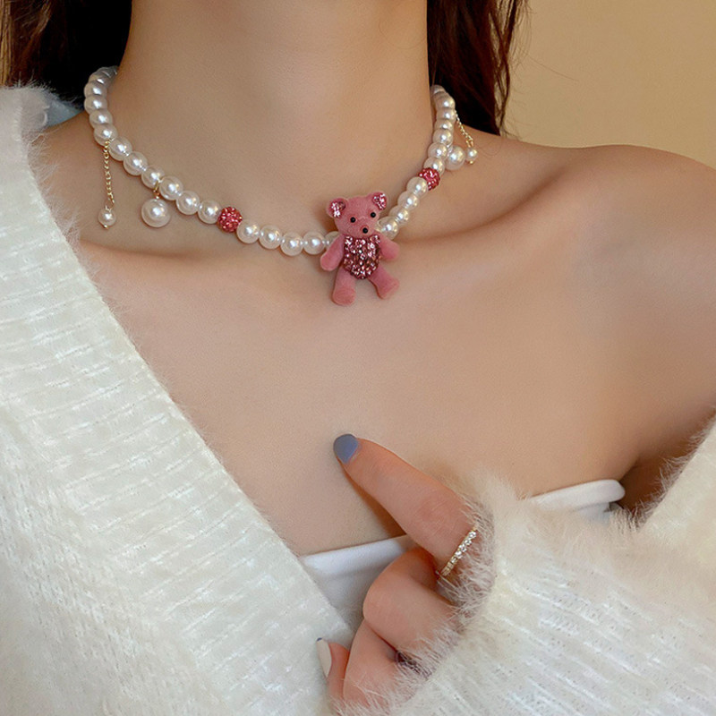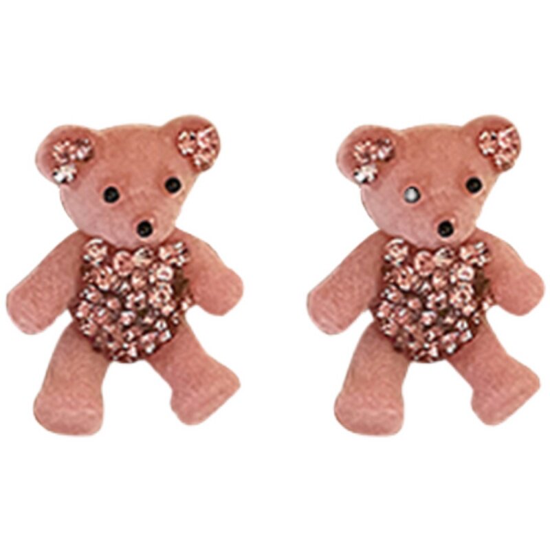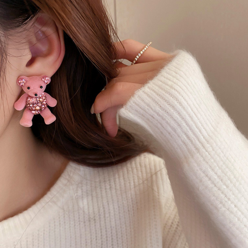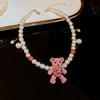 韩国镶钻植绒小熊项链耳环卡通粉色少女心甜美耳钉耳饰女