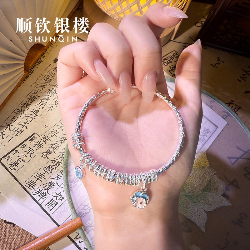 顺钦银楼S999纯银手镯女新中式足银镯子若熹银手镯生日礼物好运