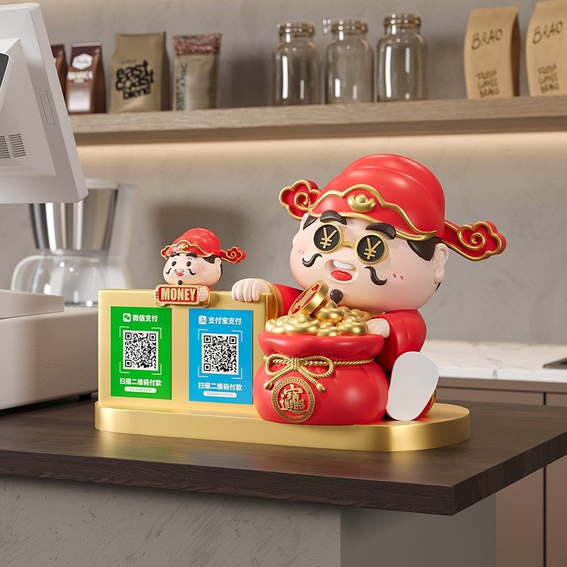 财神爷收钱二维码前台桌面装饰摆件收银台吧台糖果盘开业大吉礼物