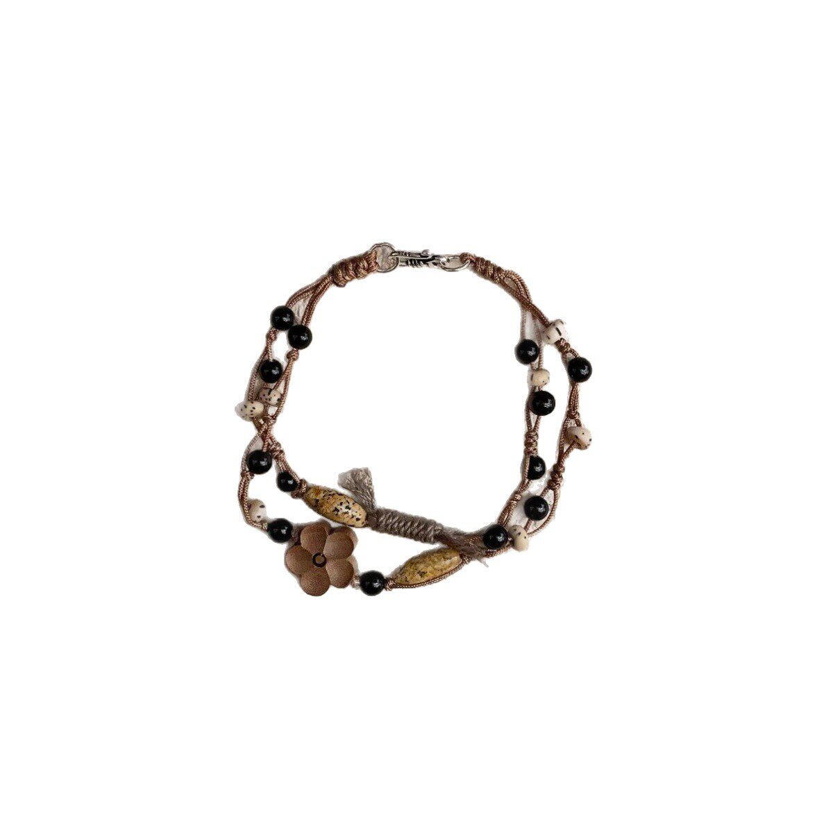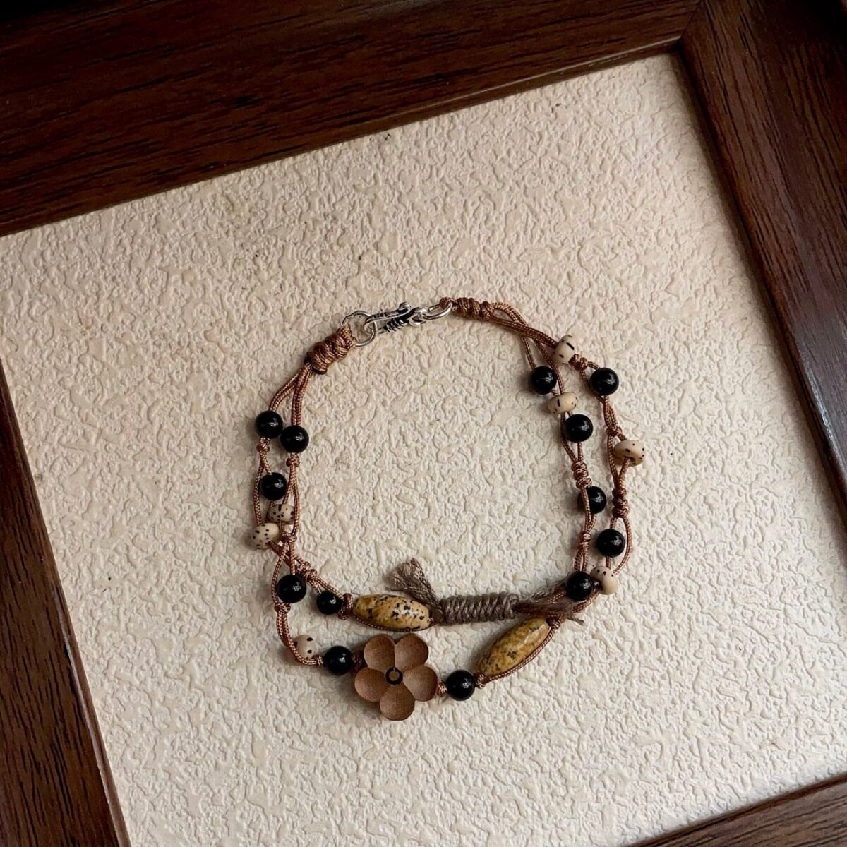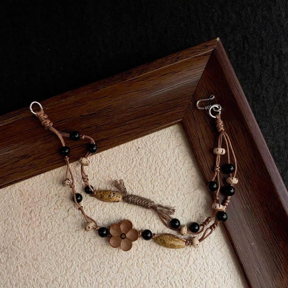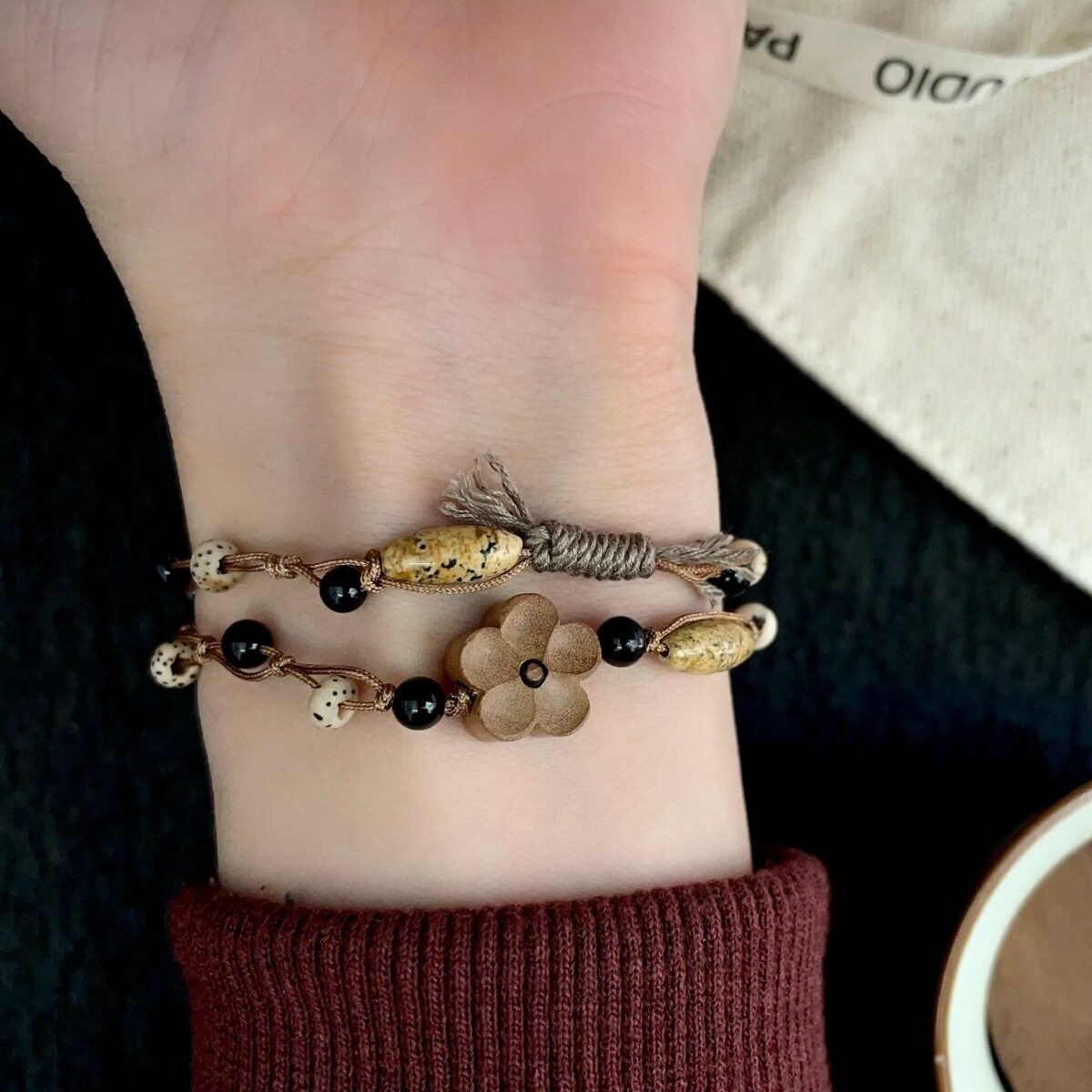 S925银天然石多宝玛瑙图画石星月菩提檀木桃花编绳手链小众复古