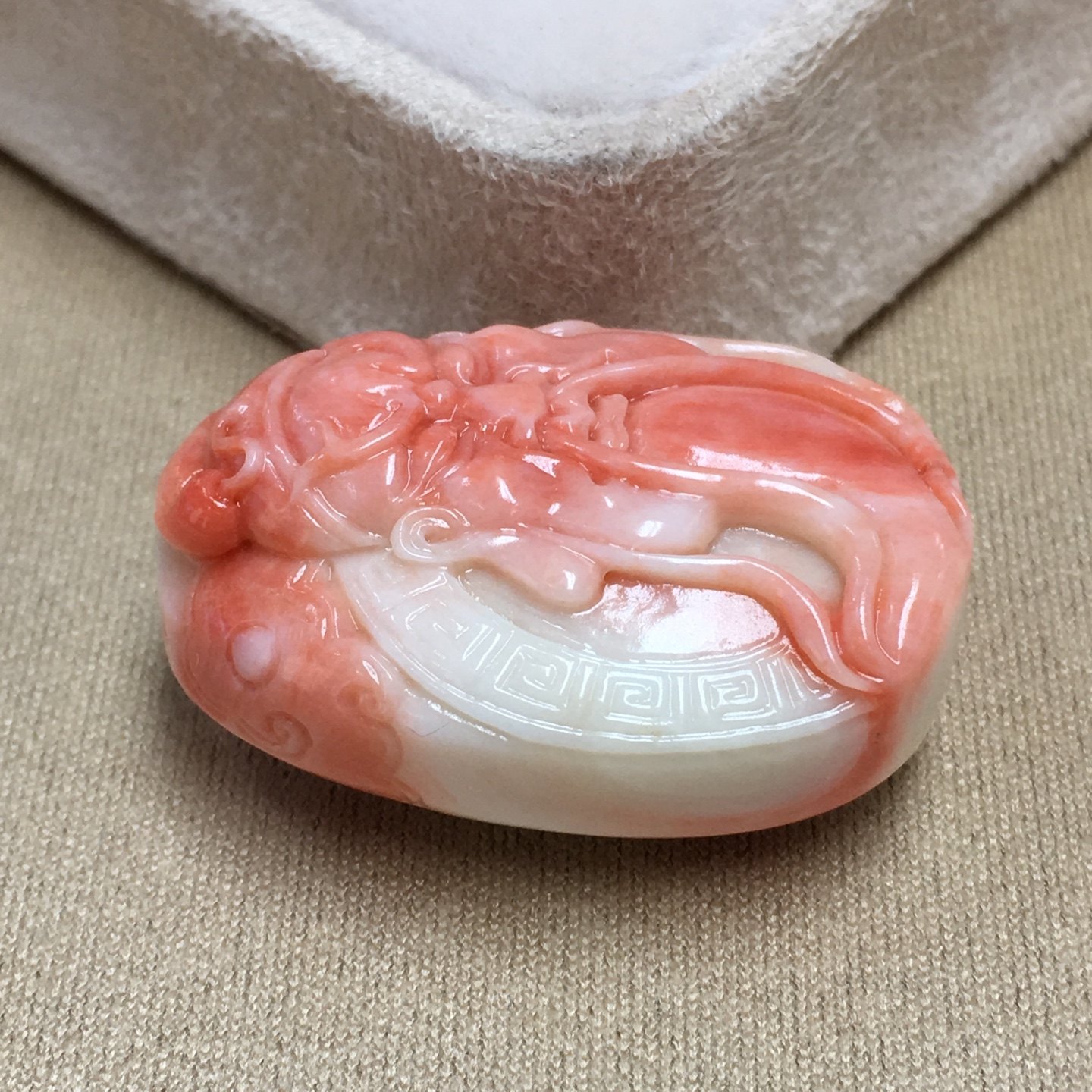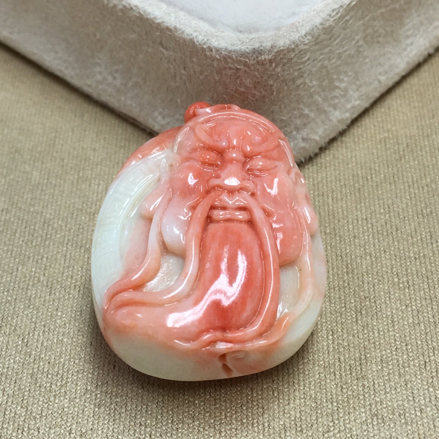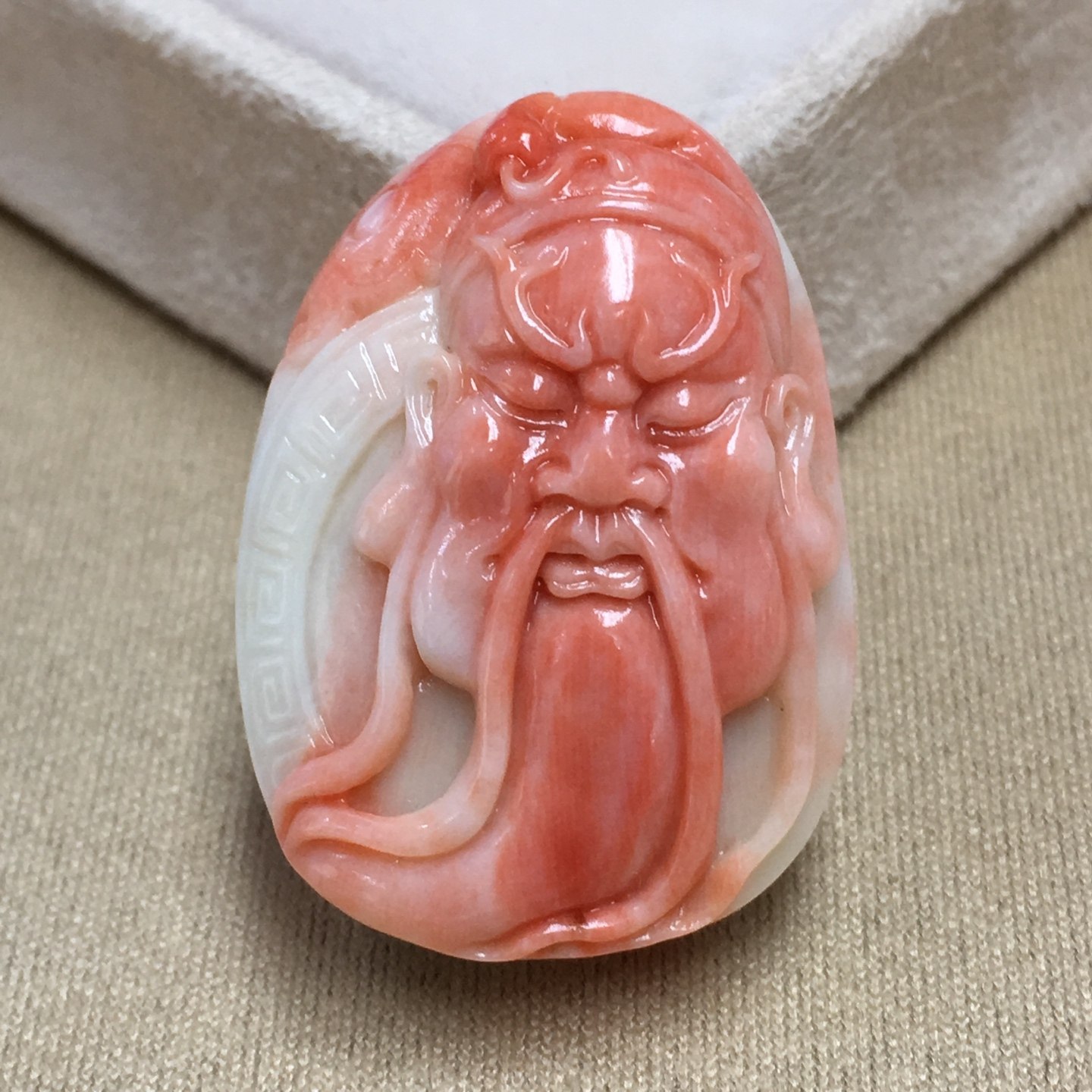 七宝珊瑚:俏色雕刻武财神关公吊坠,雕工精美,俏色巧雕一物一图