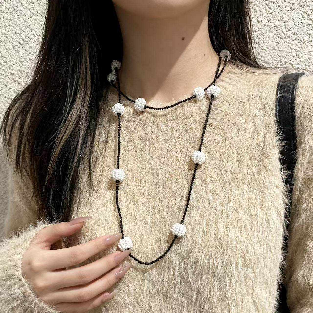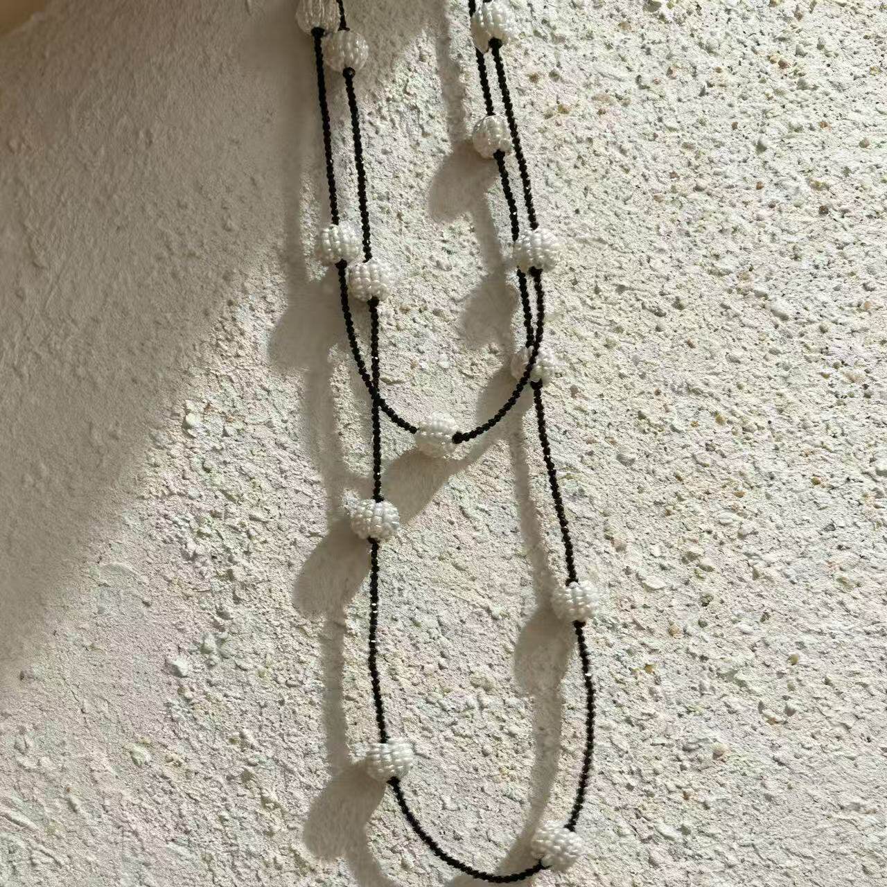 新款轻奢黑色水晶串珠几何珍珠吊坠双层项链气质时尚感锁骨链项饰