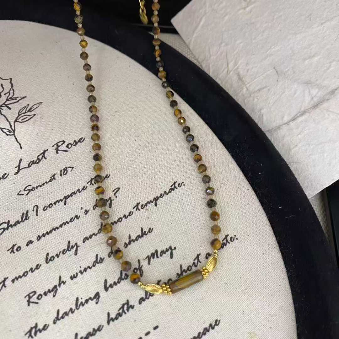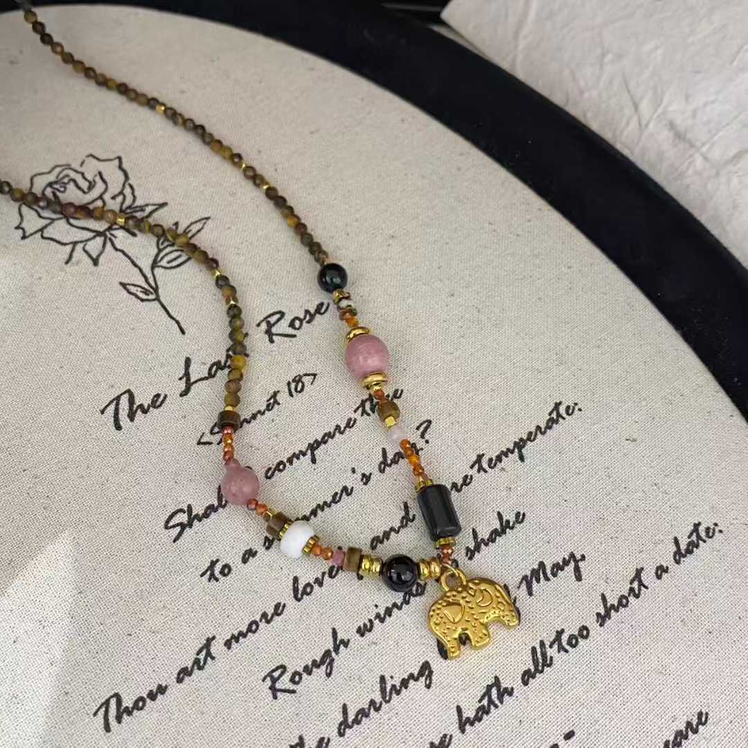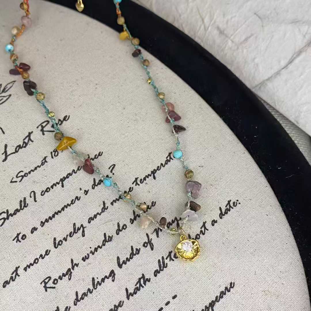 新款设计师天然石串珠项链女金色吊坠锁骨链绿色颈链