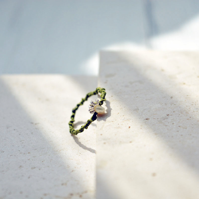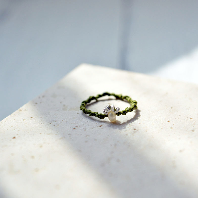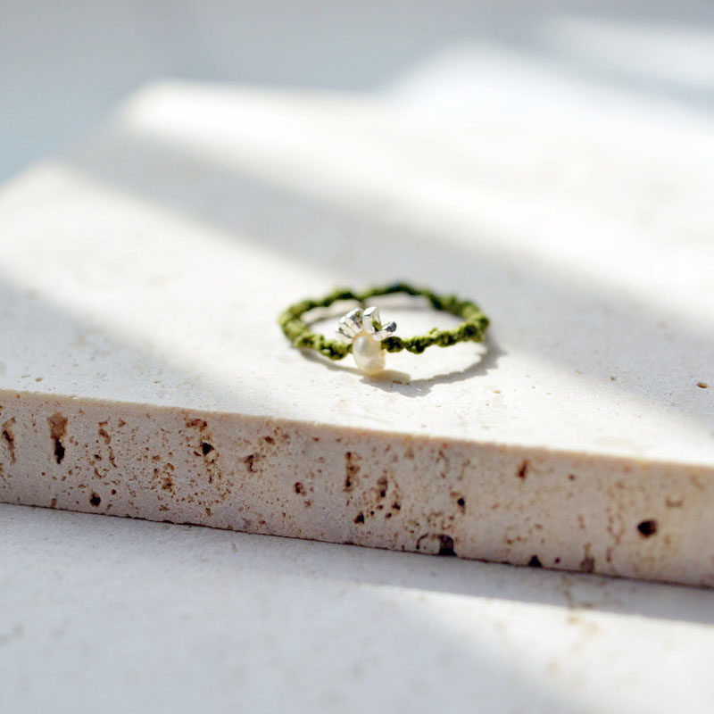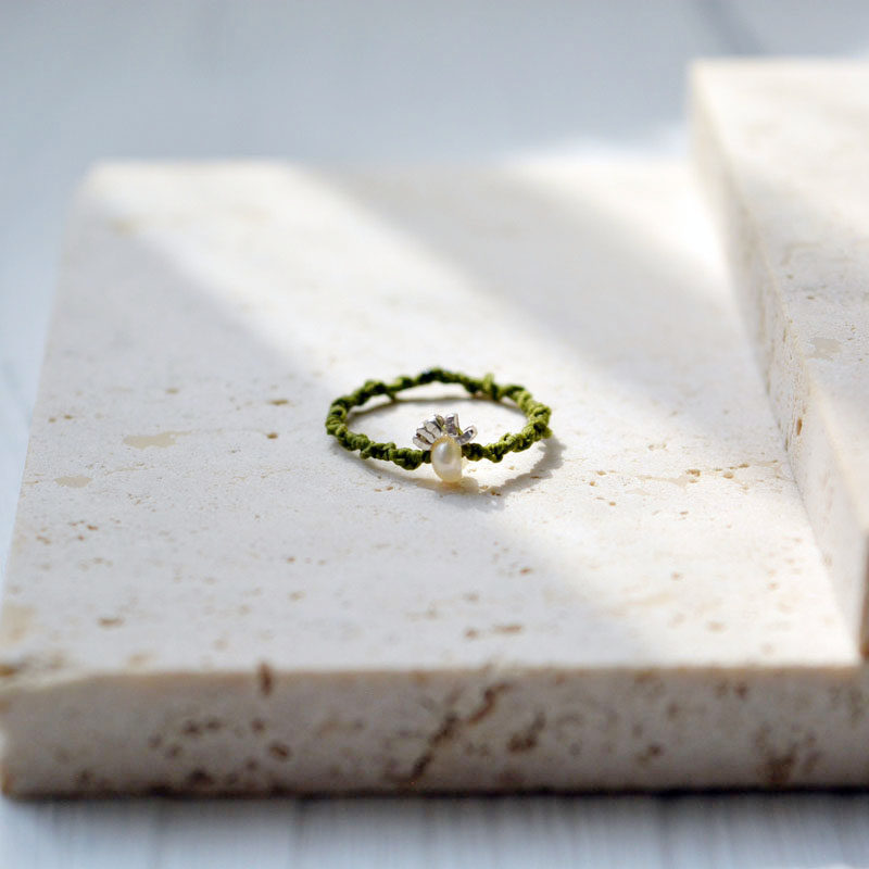 花枝 原创橄榄绿色纯手工编织戒指 韩版日系指环女珍珠碎银戒小众
