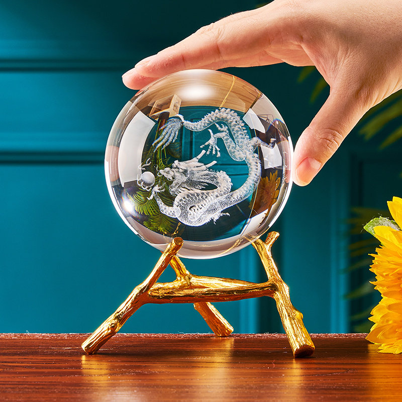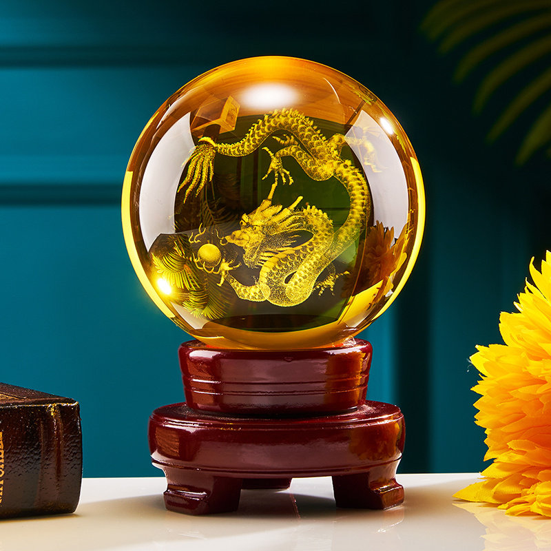 水晶球龙图案摆件黄色球内雕龙办公桌生肖龙摆设祥辟火Y神龙青龙