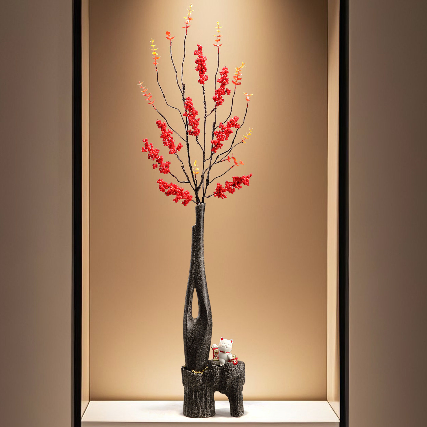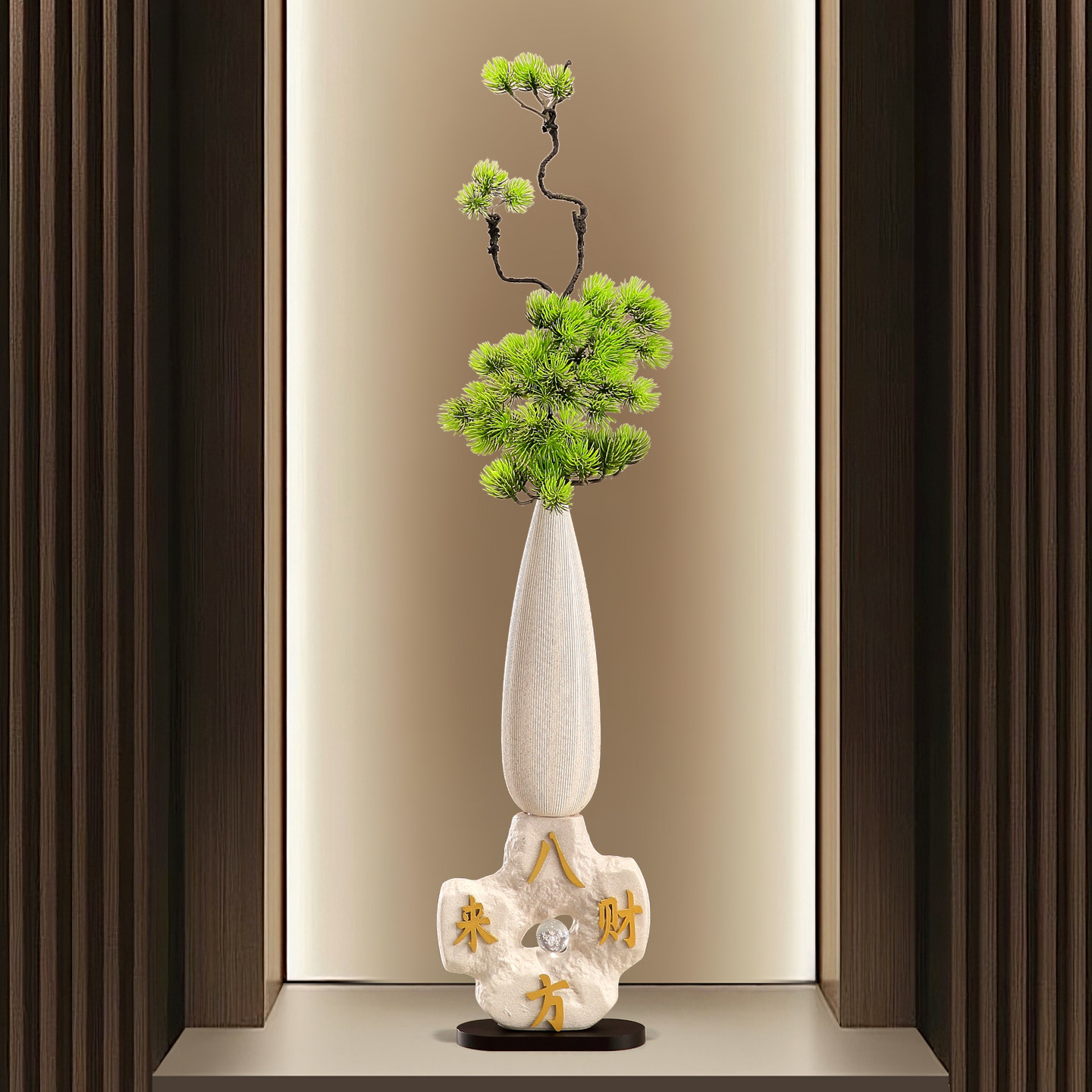 中式古风陶瓷花瓶迎客松入门玄关柜壁龛细长摆件高级感客厅装饰品