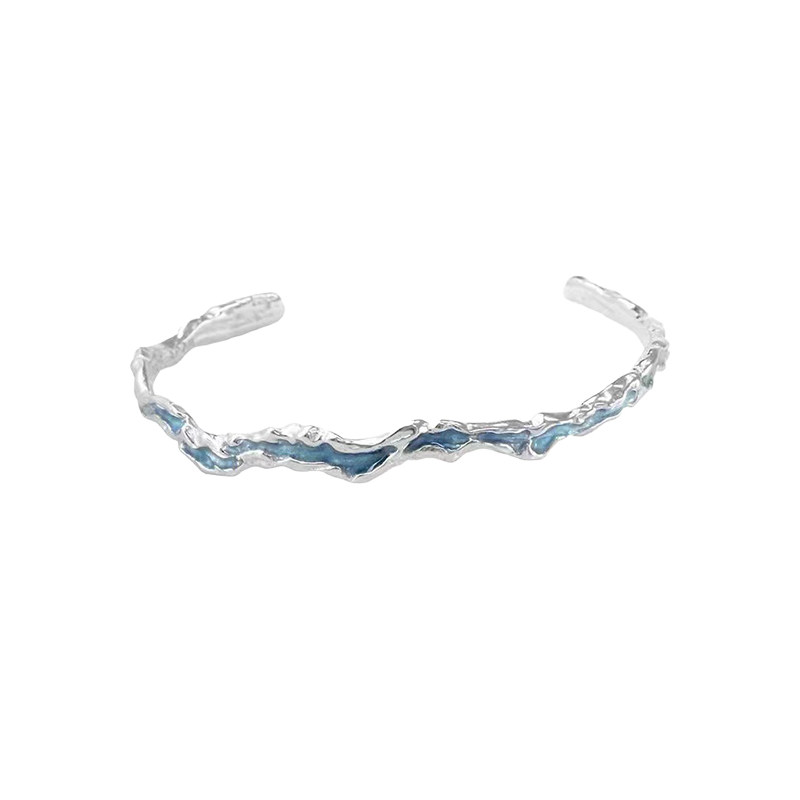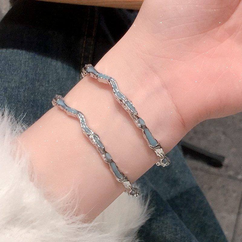 液态冷淡风素圈手镯女轻奢小众精致蓝色滴釉海浪开口镯子手环饰品