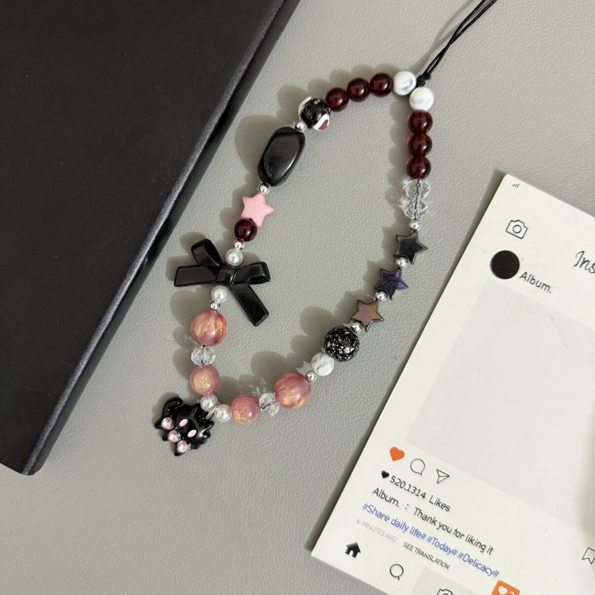 GIF哥特暗黑系Y2K黑色蝴蝶结黑猫串珠链钥匙扣挂件适用手机壳配饰