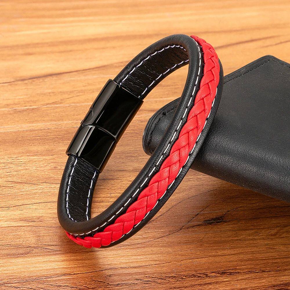 Black & Red Braided Rope Leather Bracelet Men Stainless Stee