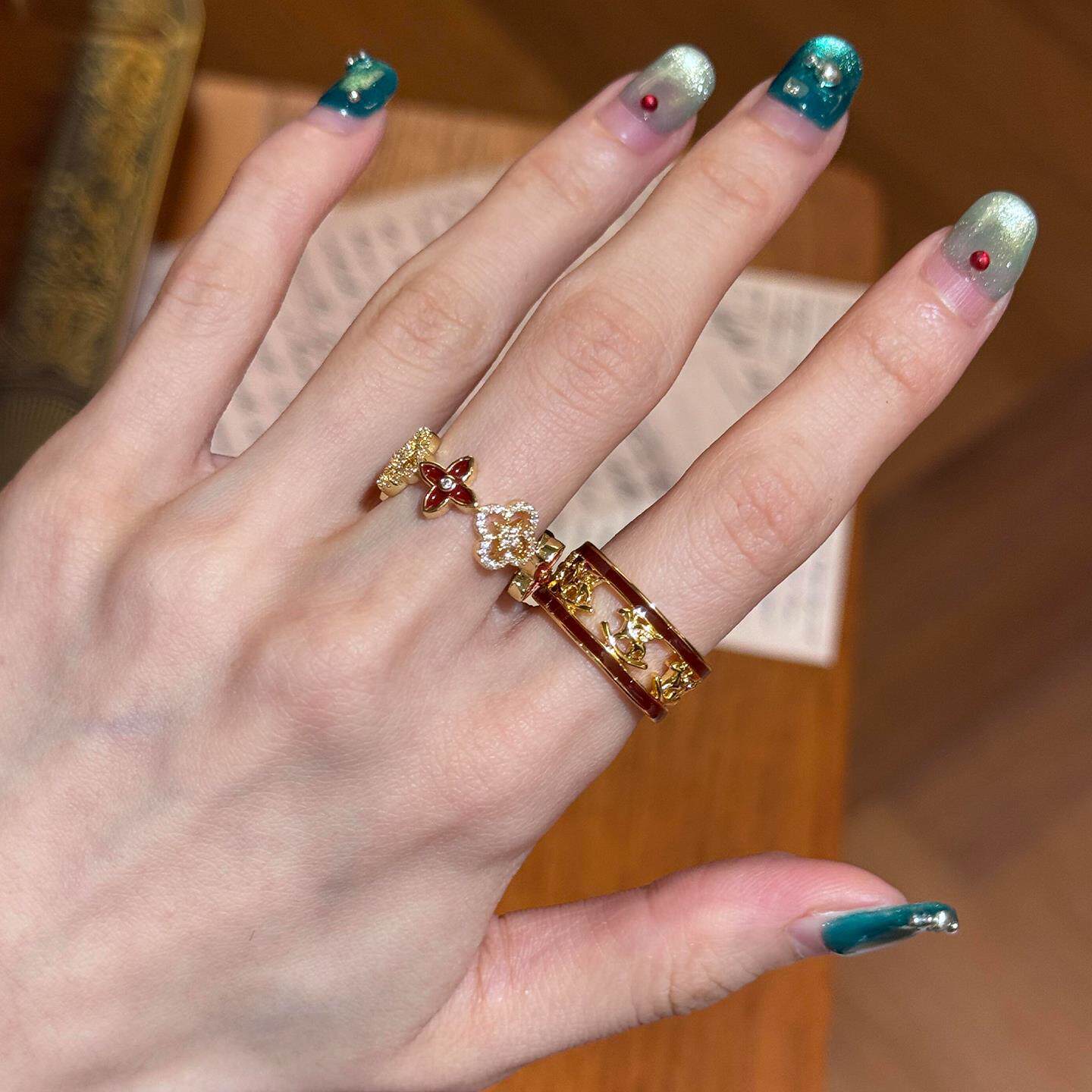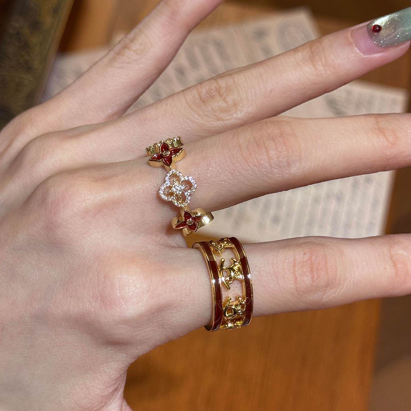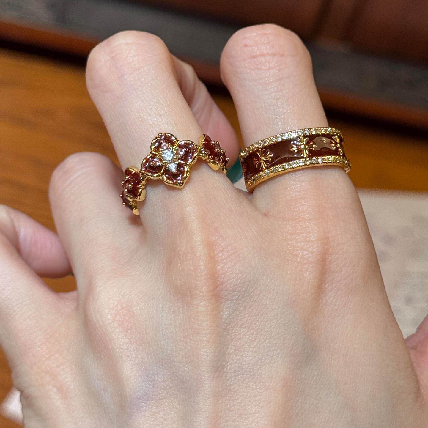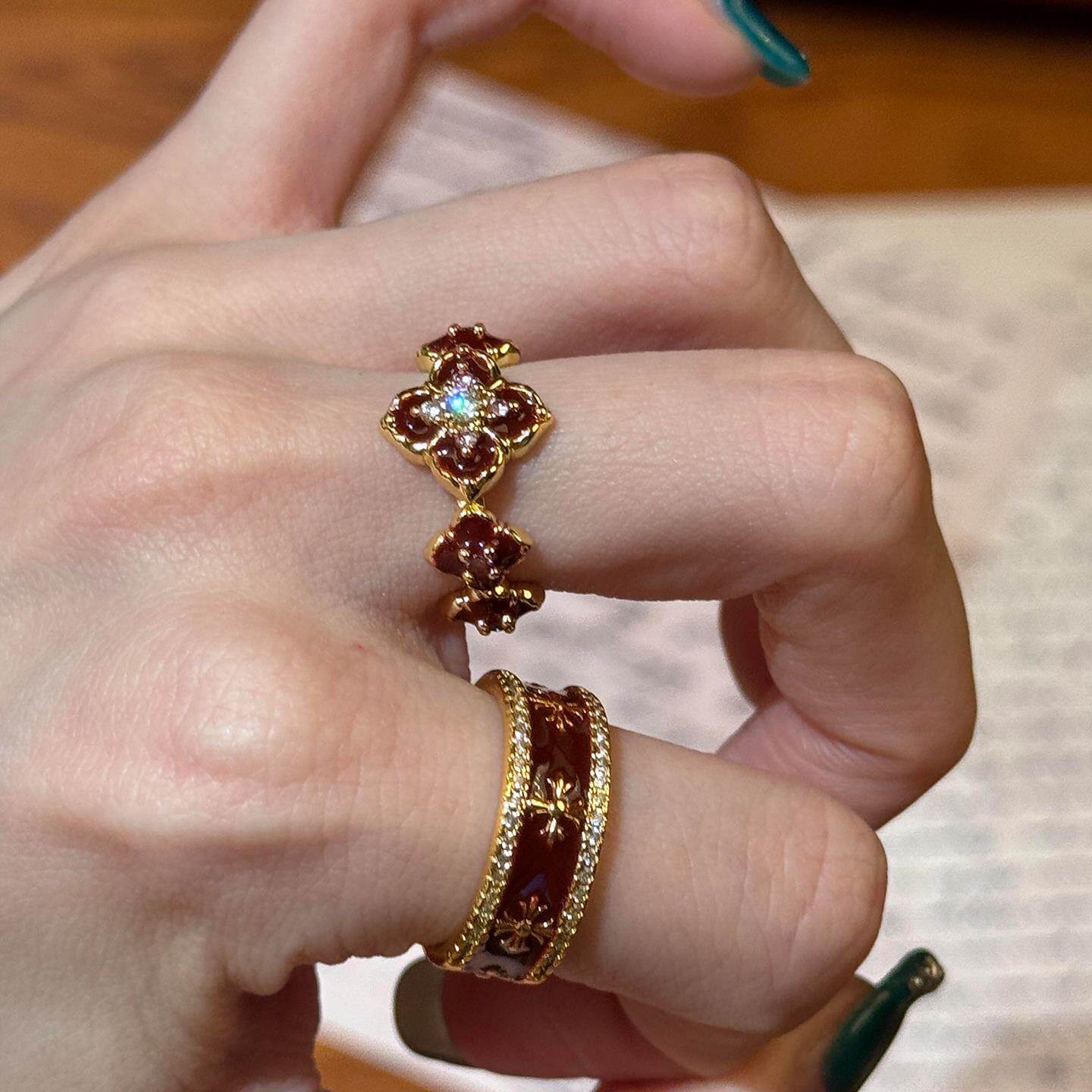 复古老钱风红色滴釉四叶草戒指女小众设计显白指环轻奢百搭食指戒