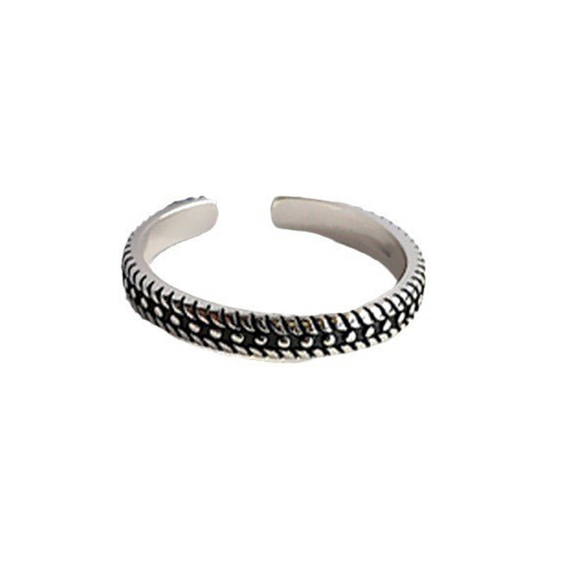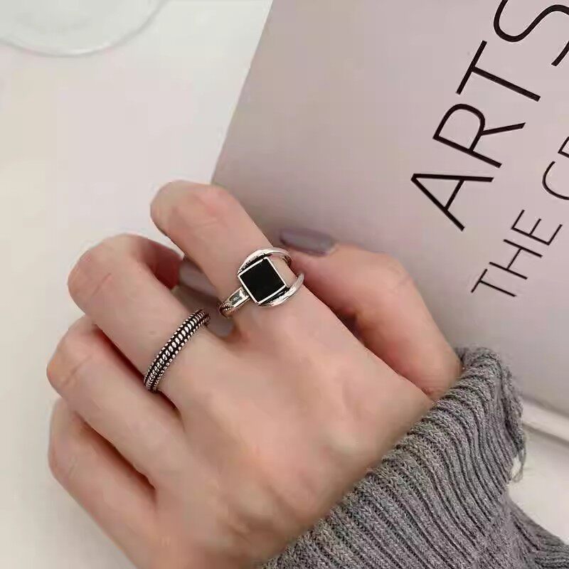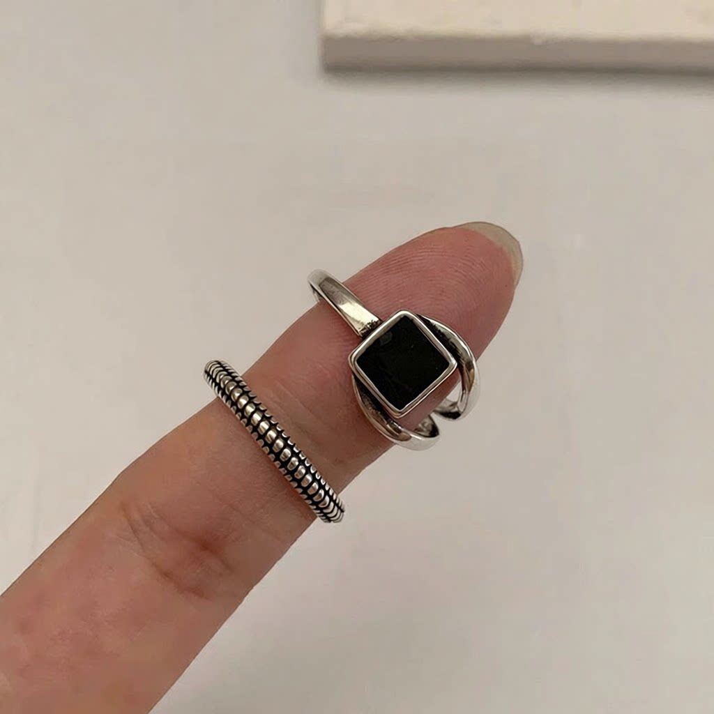 复古黑色几何方形戒指女小众简约麻花食指戒时尚做旧仿泰银开口戒