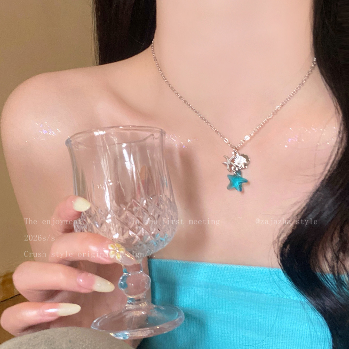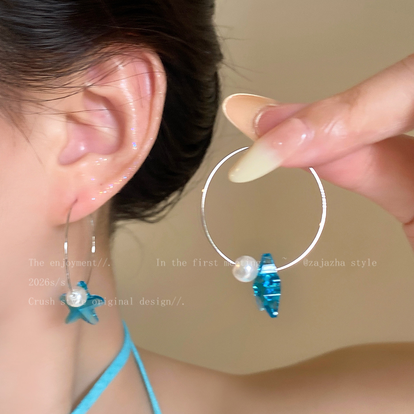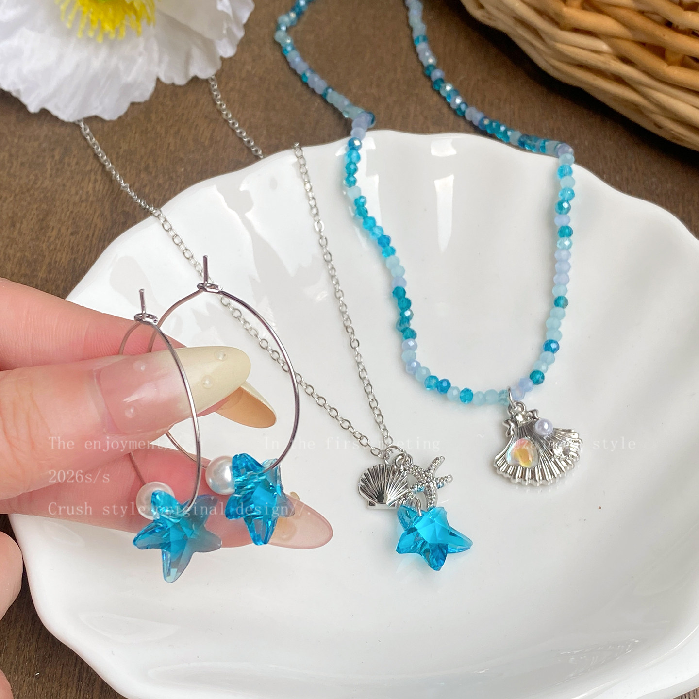 蓝调时刻~蓝色海星贝壳项链女小众高级感耳圈海边氛围感穿搭配饰
