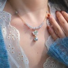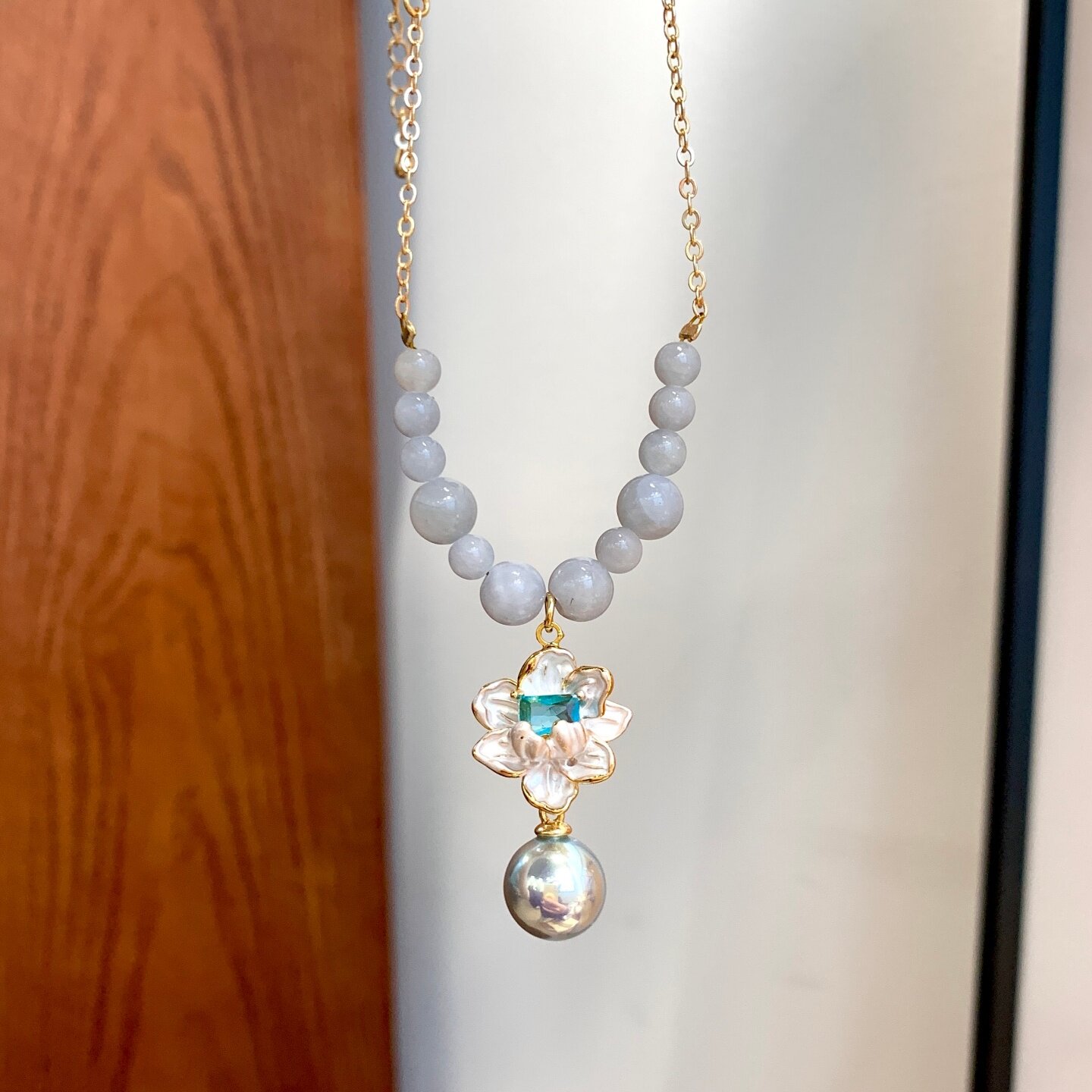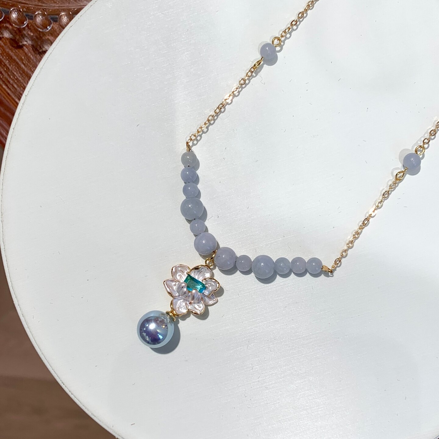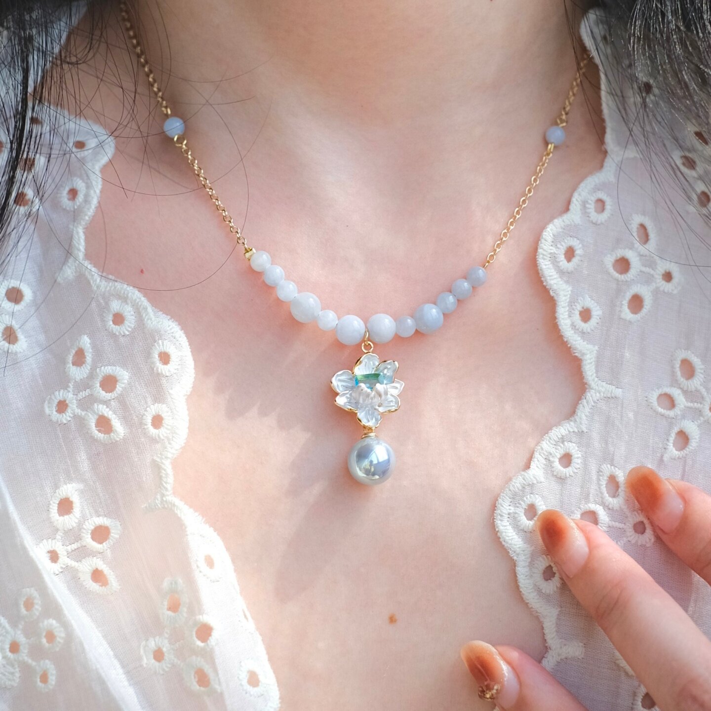 《薄荷曼波》原创春夏清新蓝色珍珠花朵吊坠轻奢小众锁骨链项链女