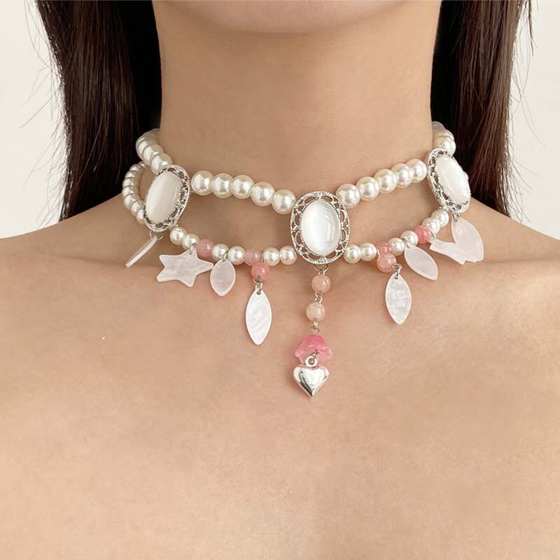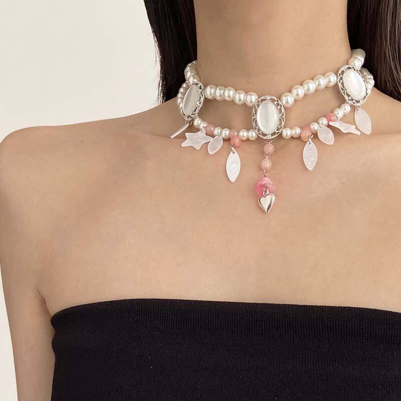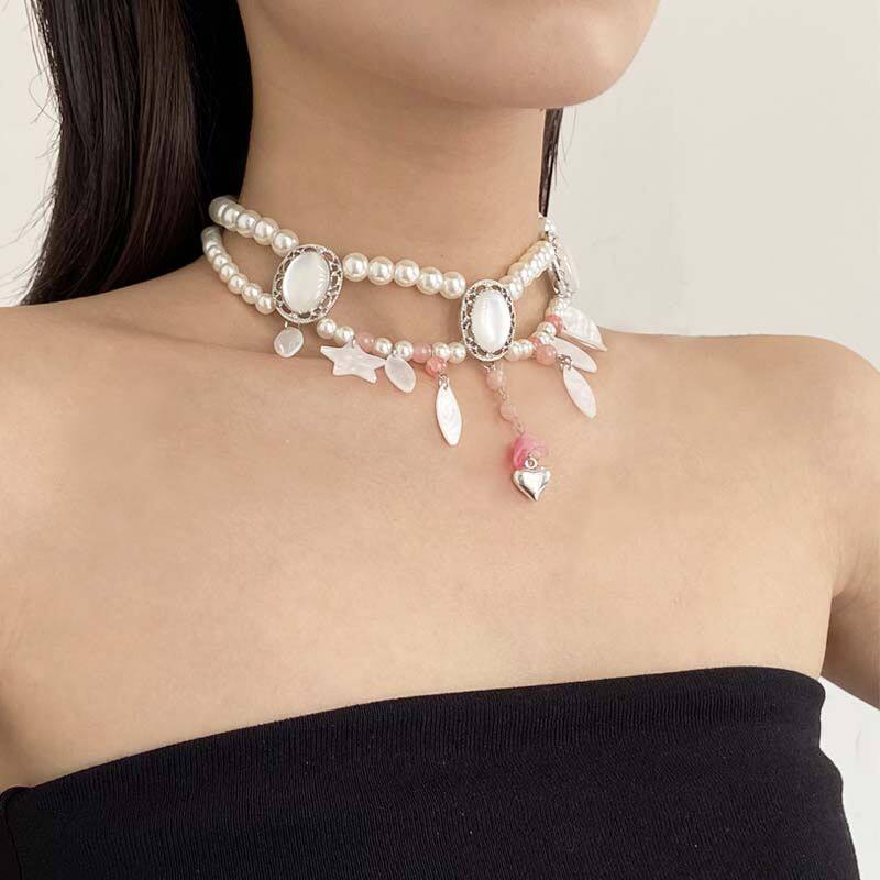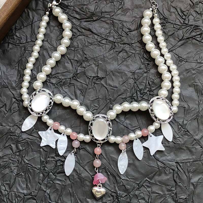 法式优雅双层珍珠拼水晶贝壳项链2025新款轻奢爱心星星锁骨链颈链