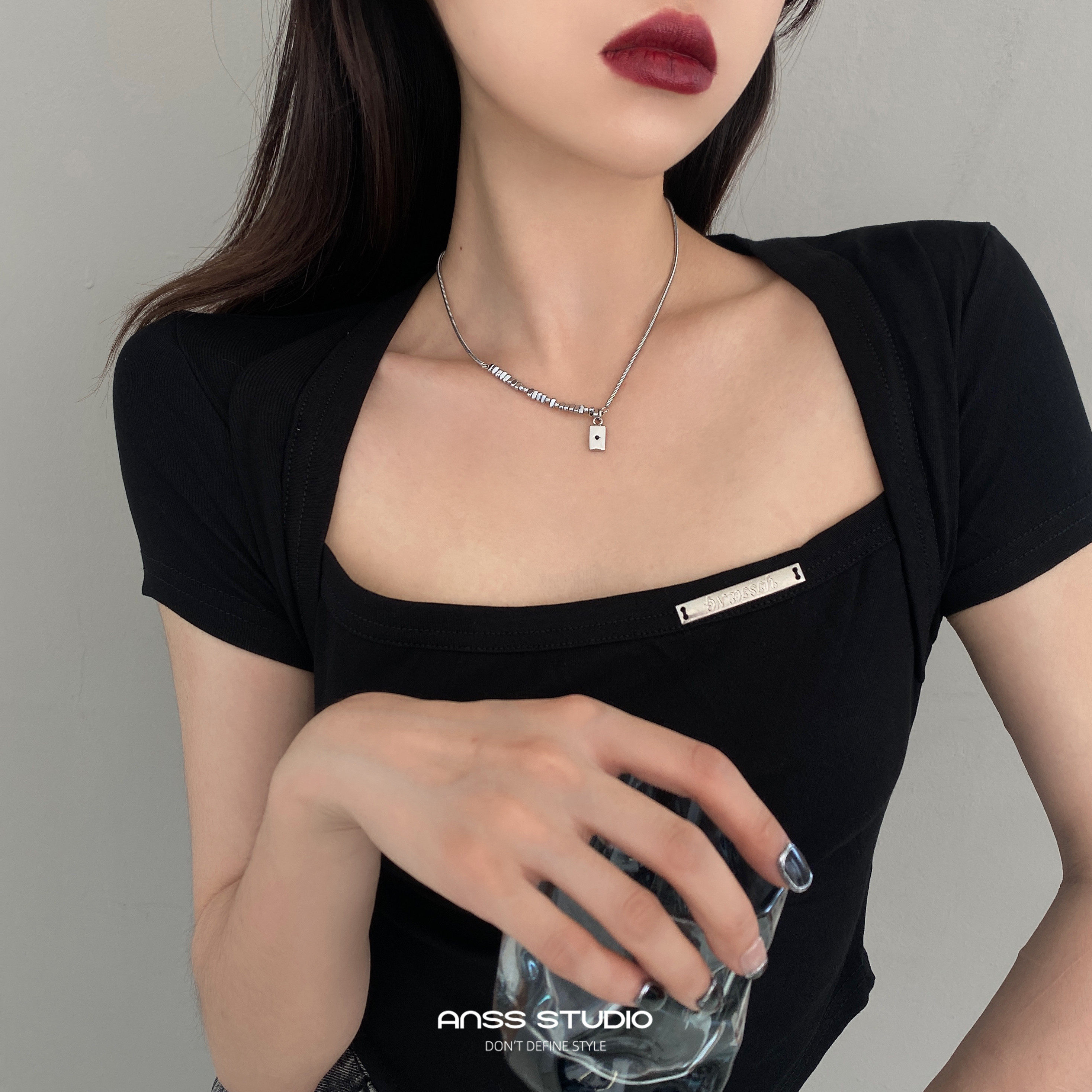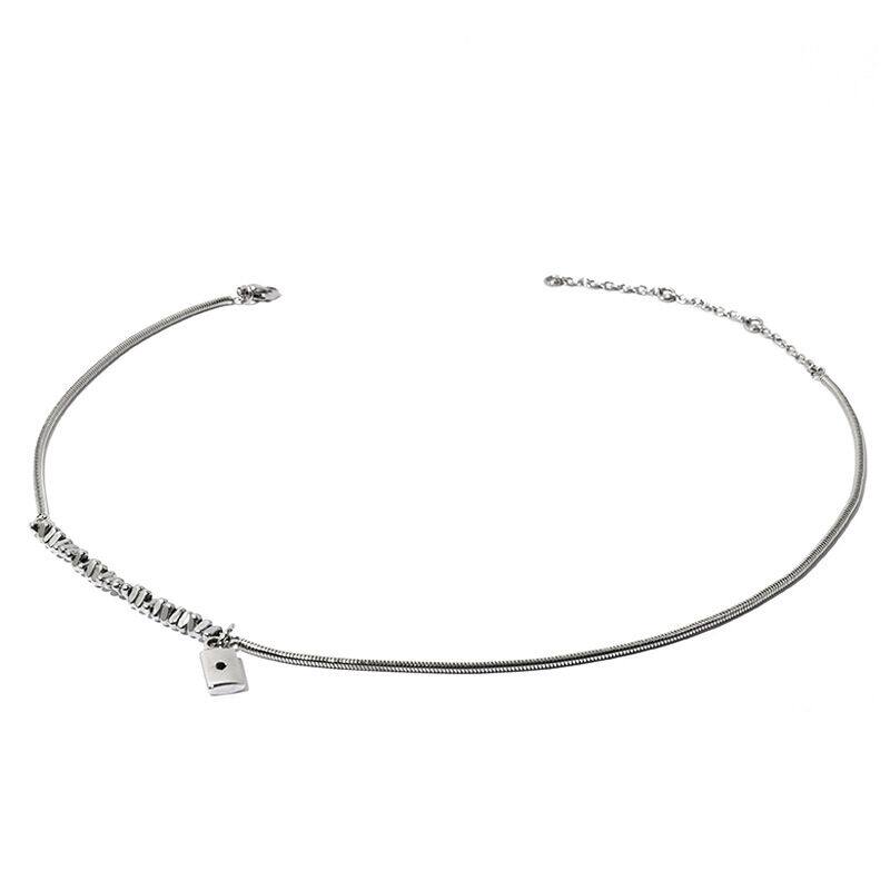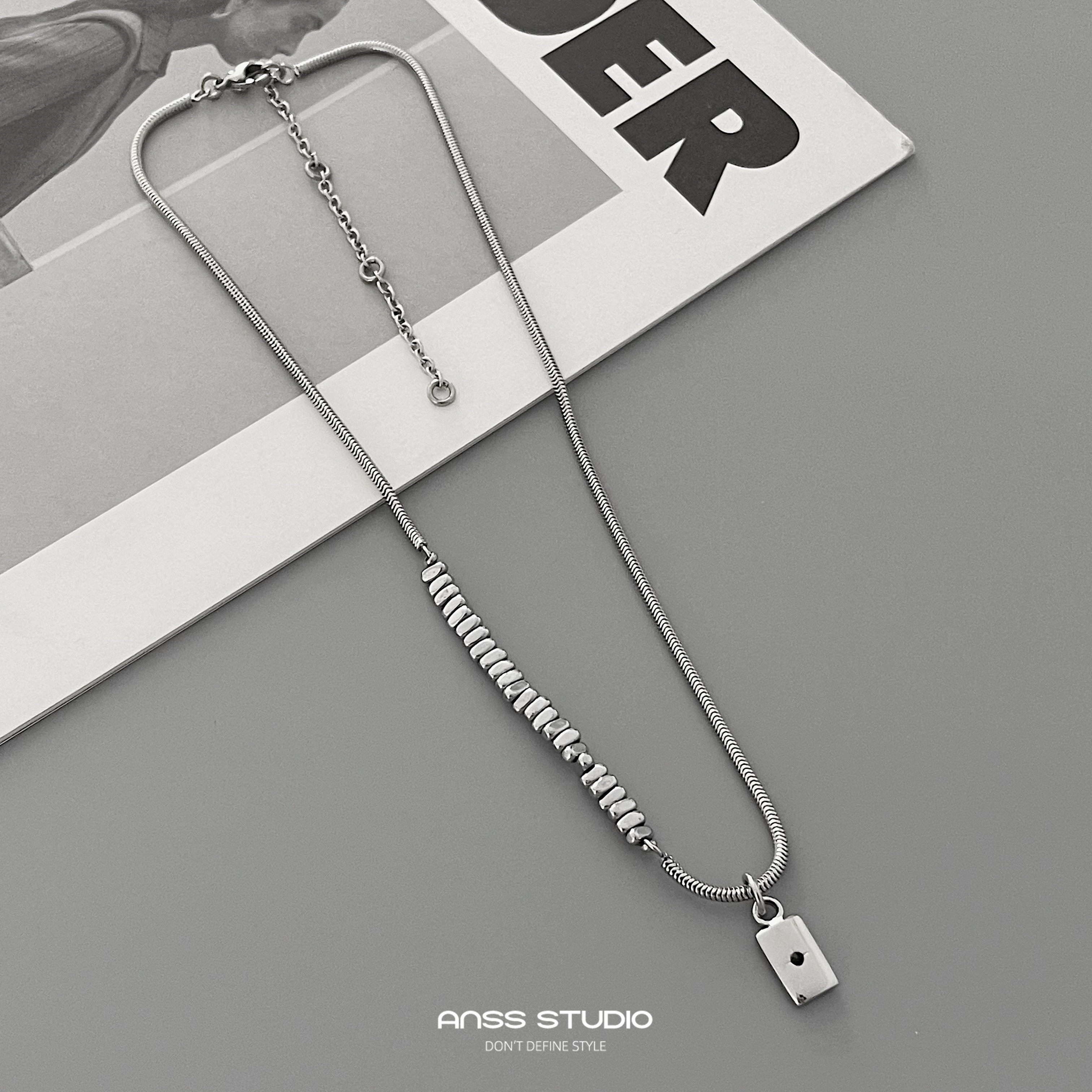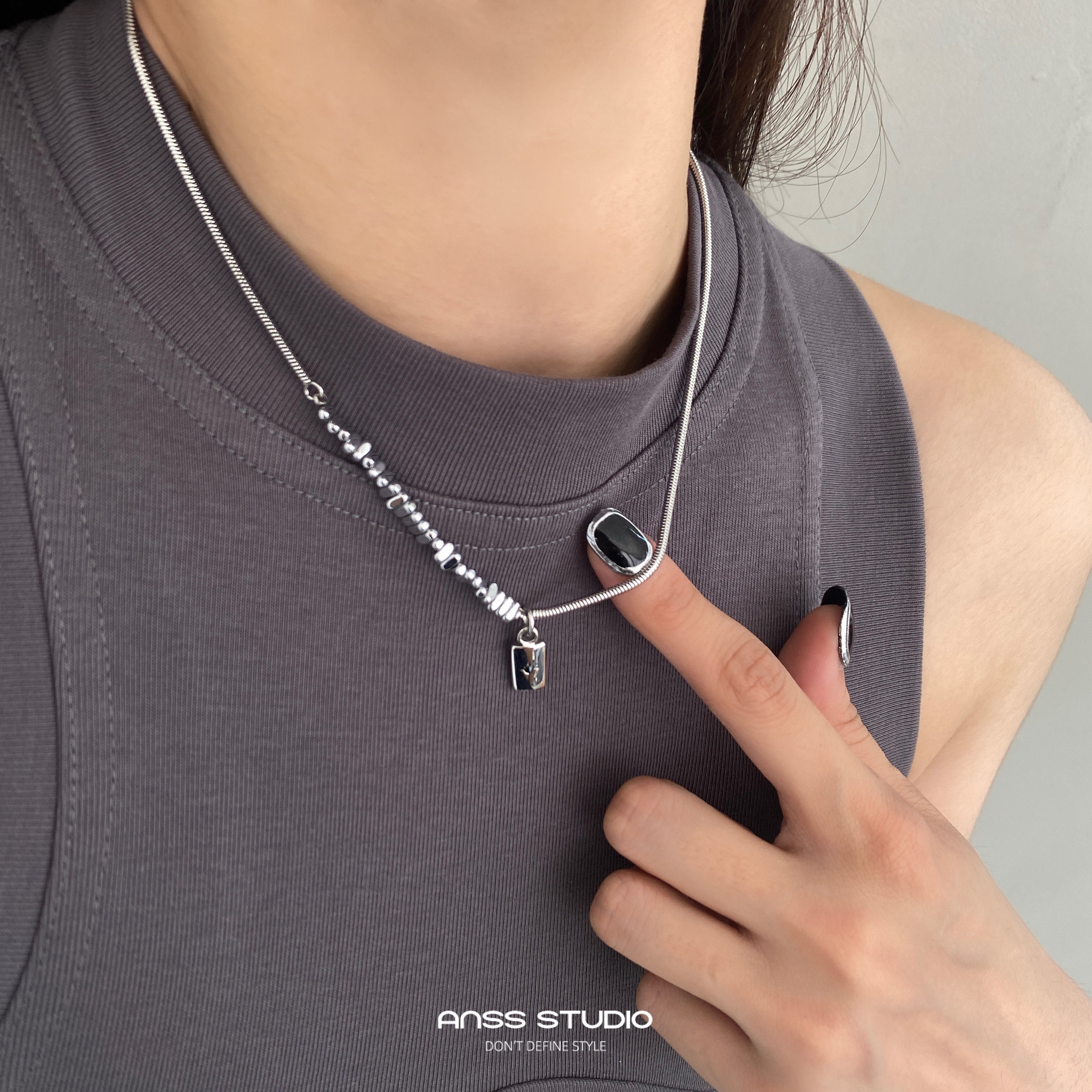 【ANSS】短款蛇骨链拼接碎石项链女 质感方块黑色锆石吊坠锁骨链