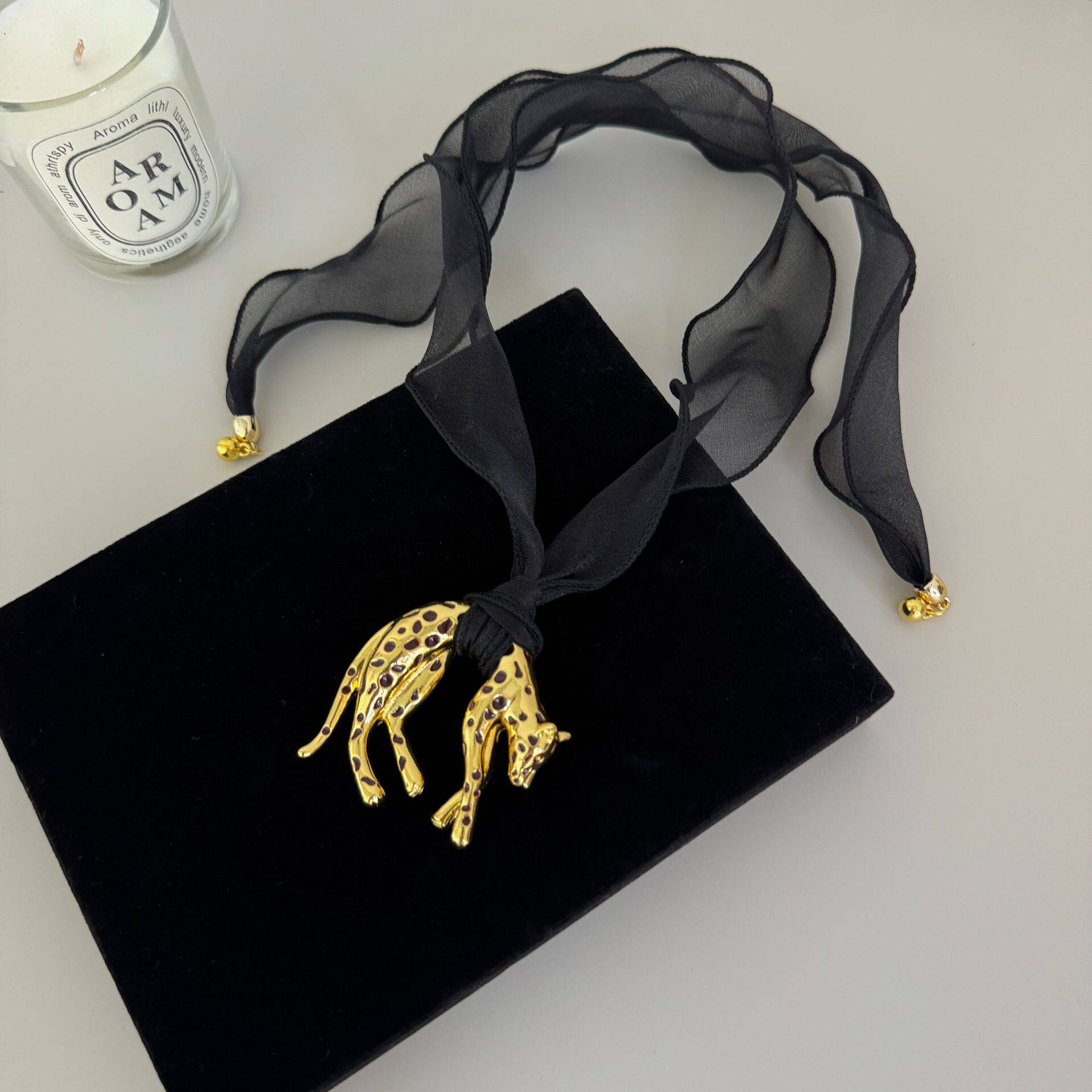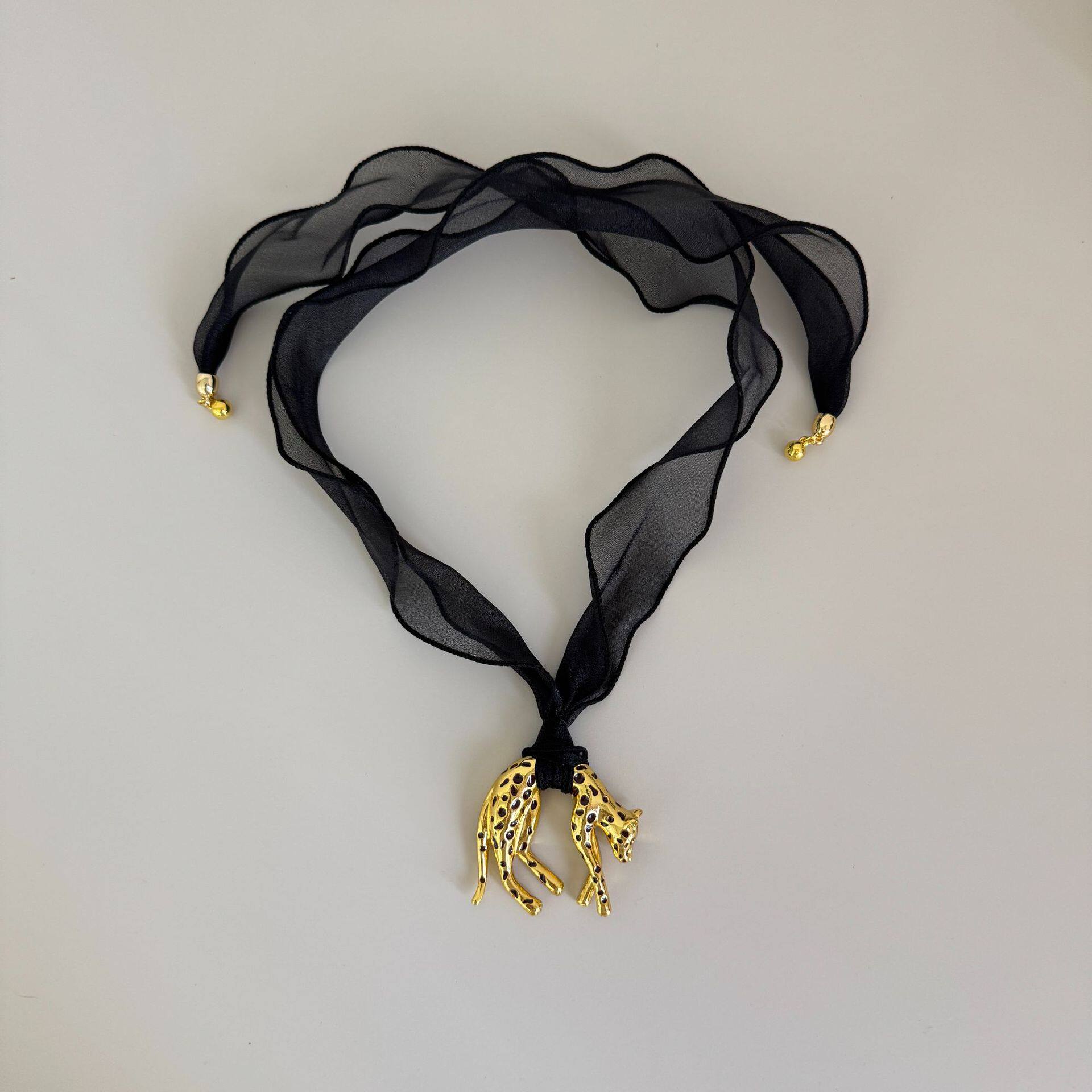 法式复古黑色丝巾黑金豹子吊坠项链女小众设计时髦个性锁骨毛衣链