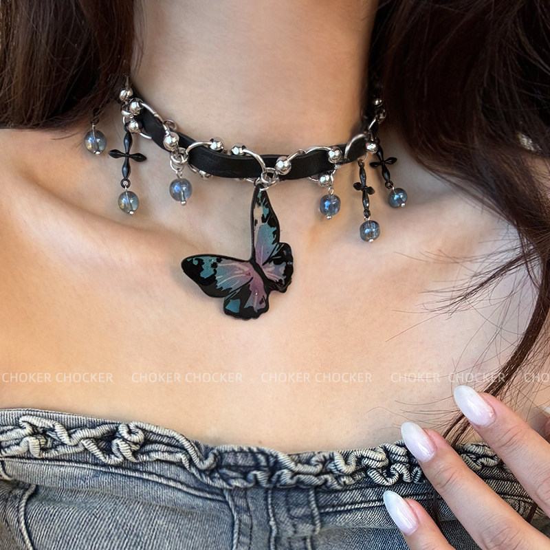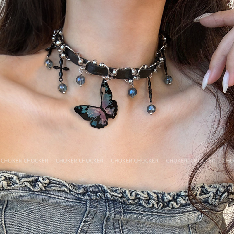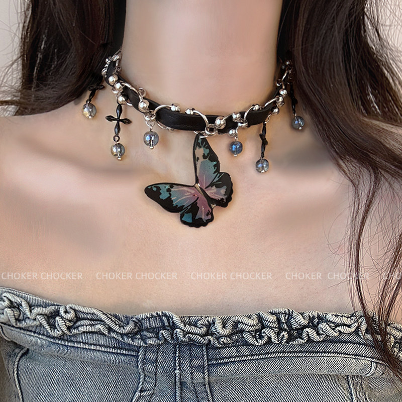 炫彩蝴蝶choker项圈颈链黑色皮质辣妹女款2024新款chocker高级感