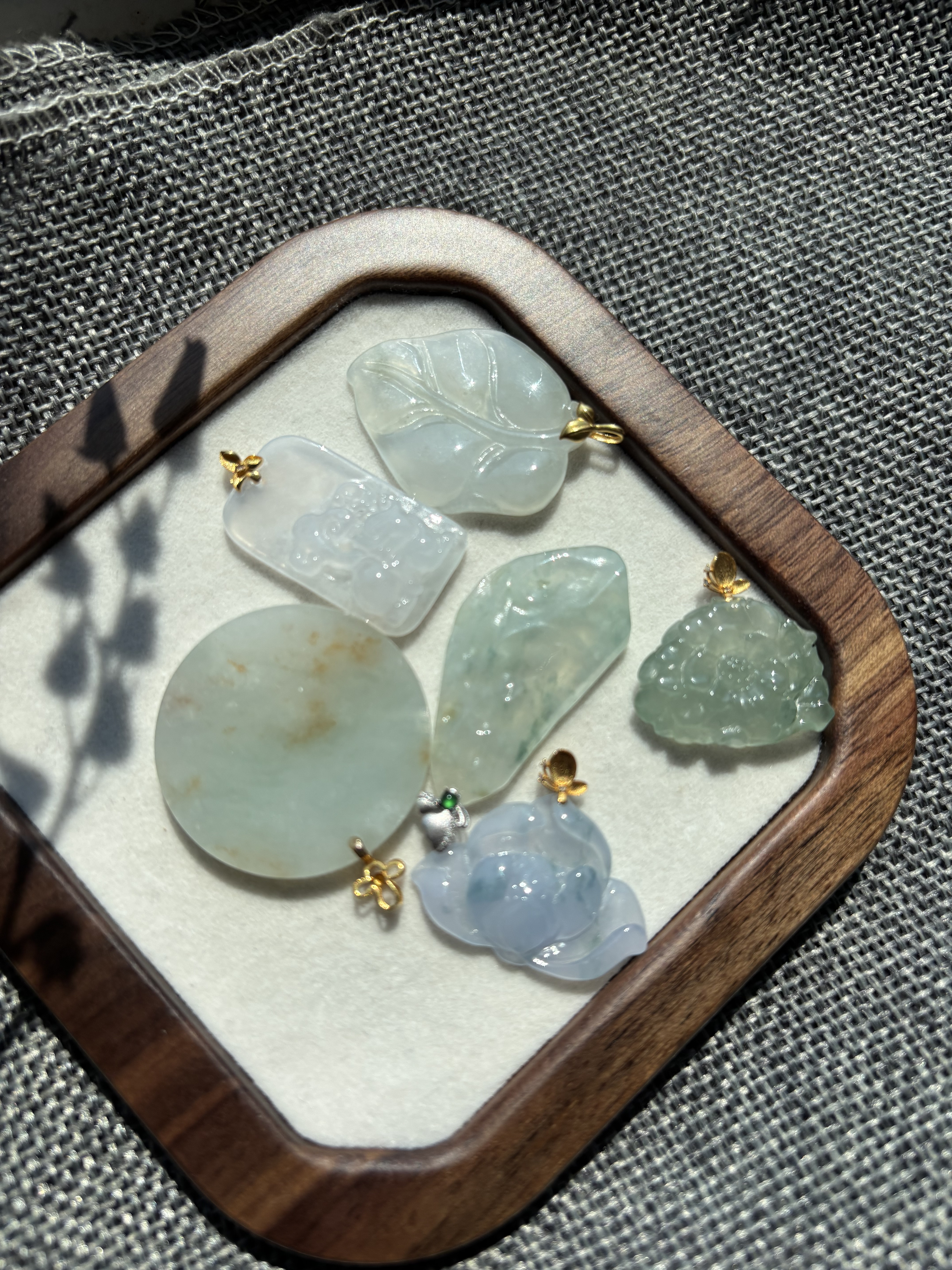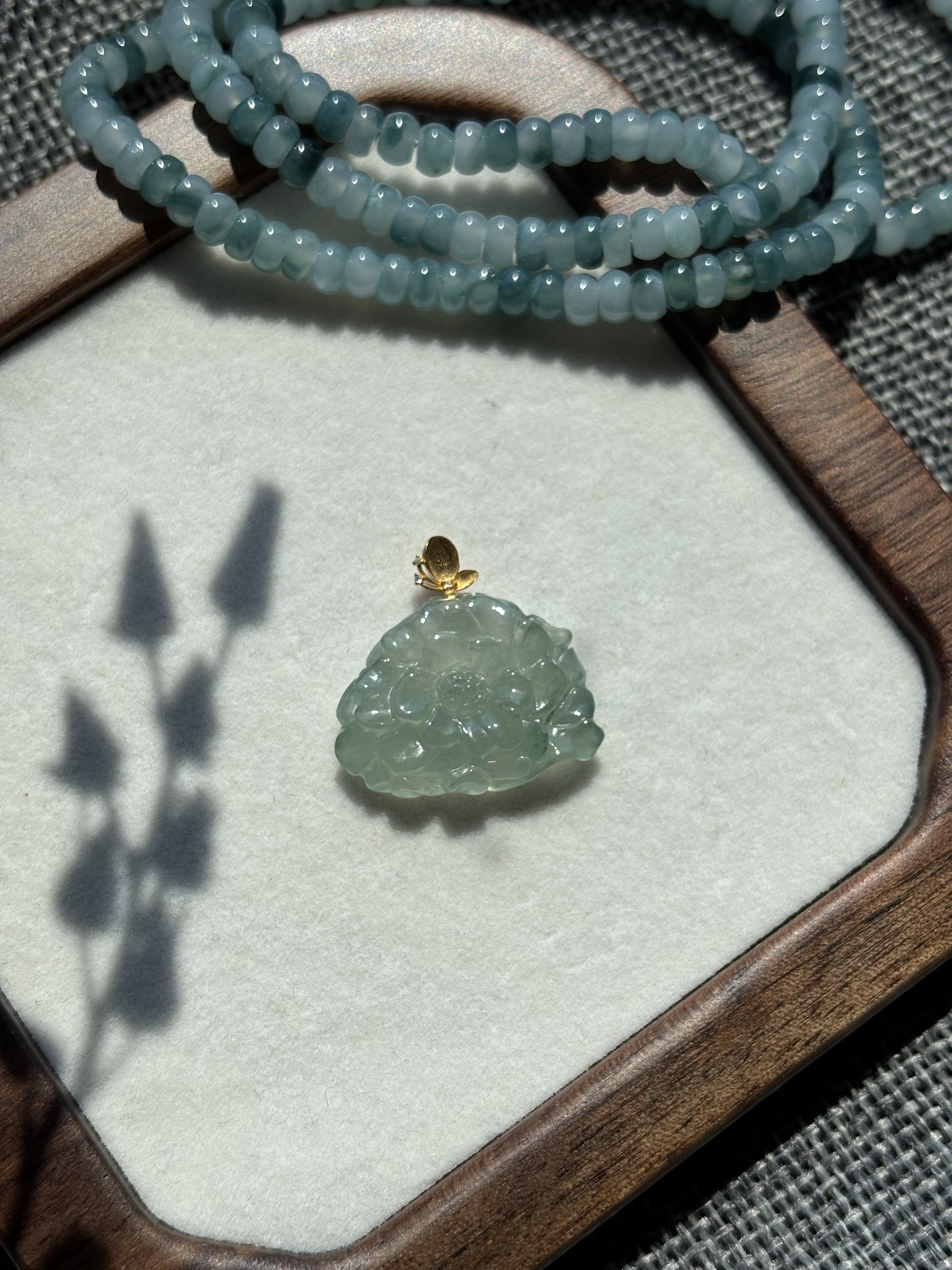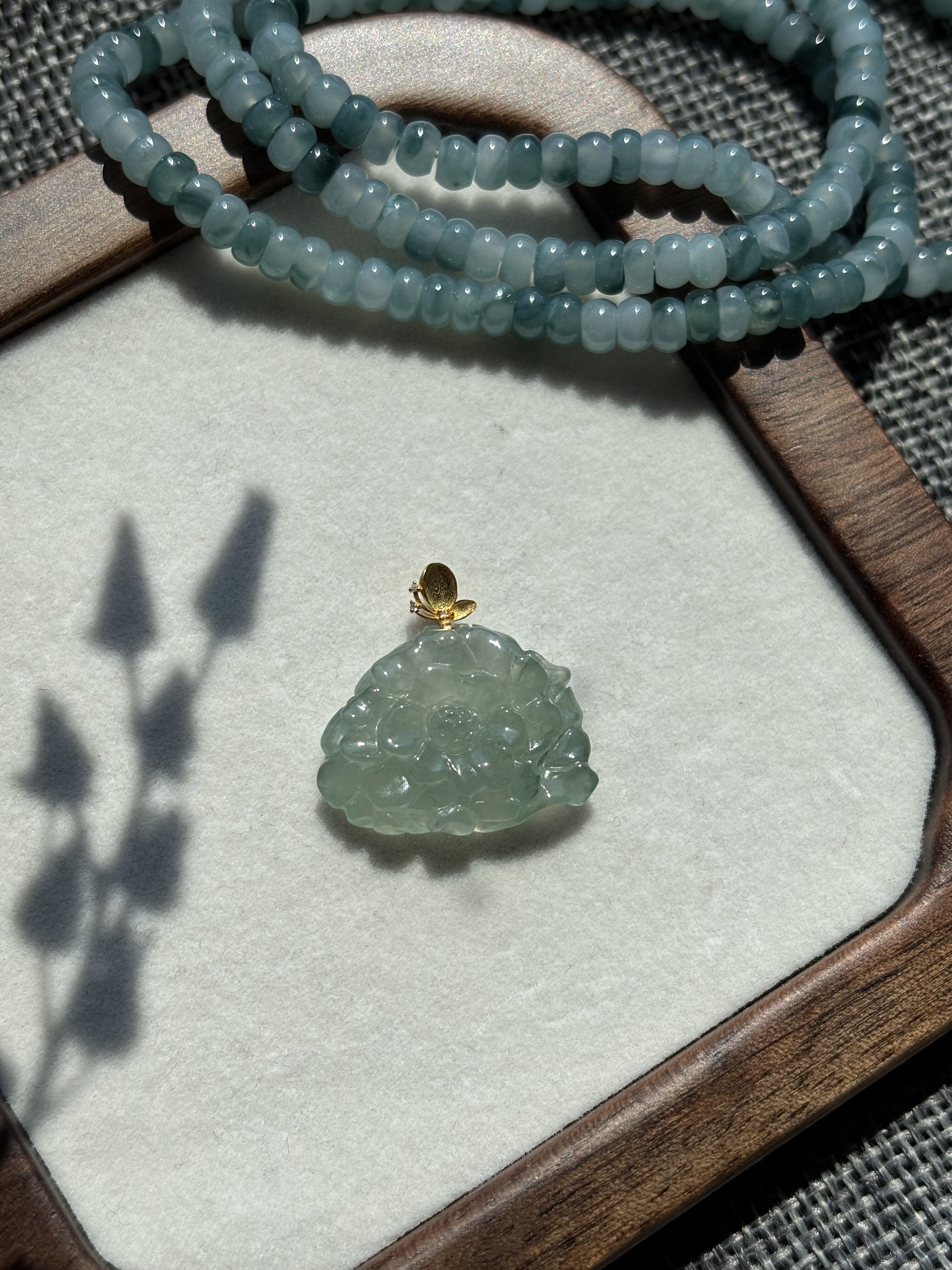 天然缅甸翡翠A货 晴底色 冰种18k金扣头牡丹花吊坠