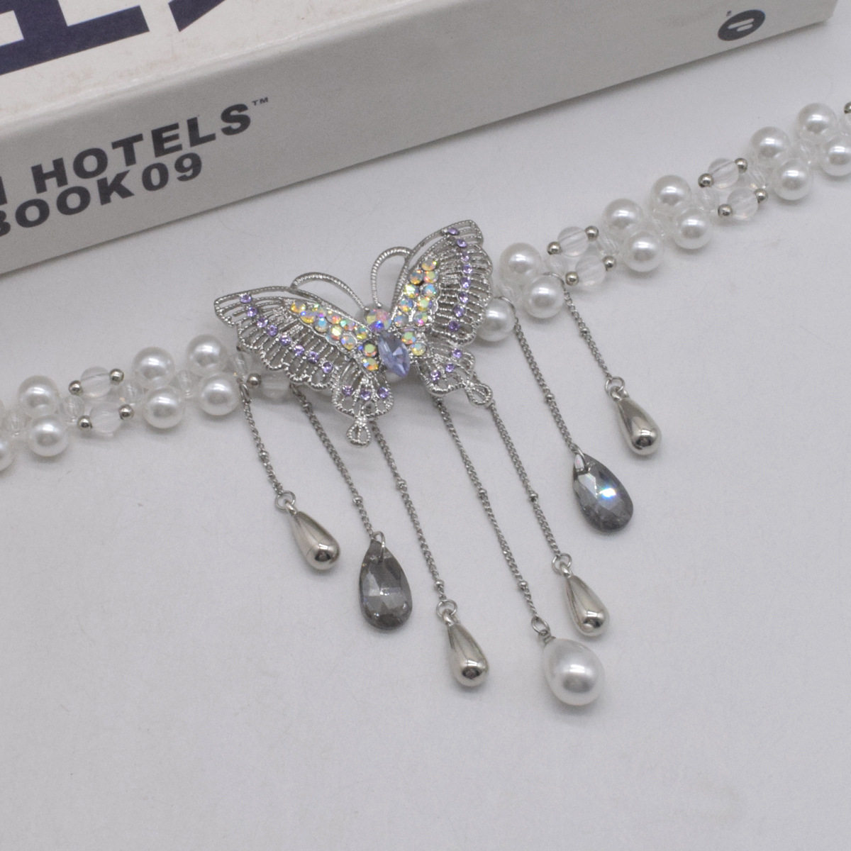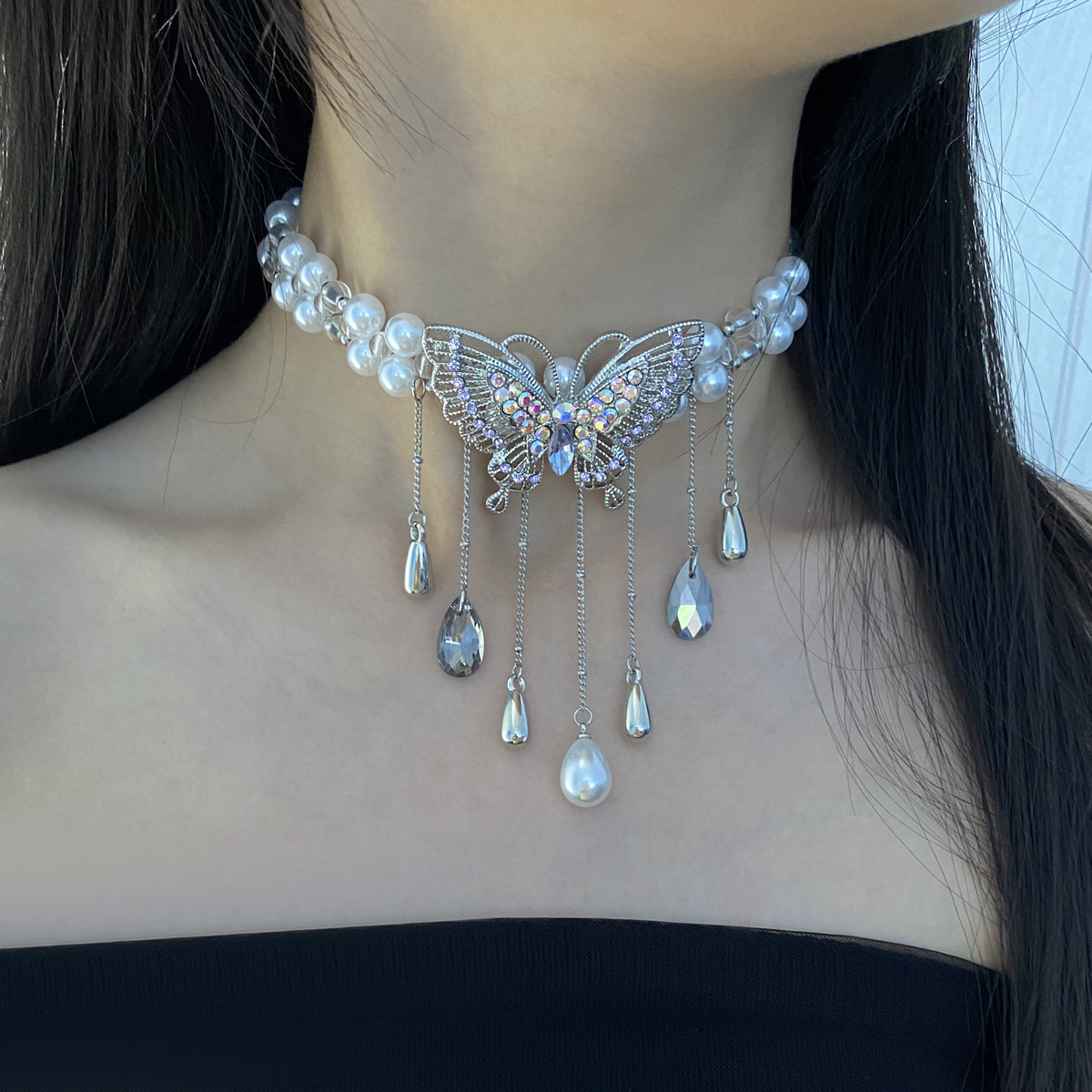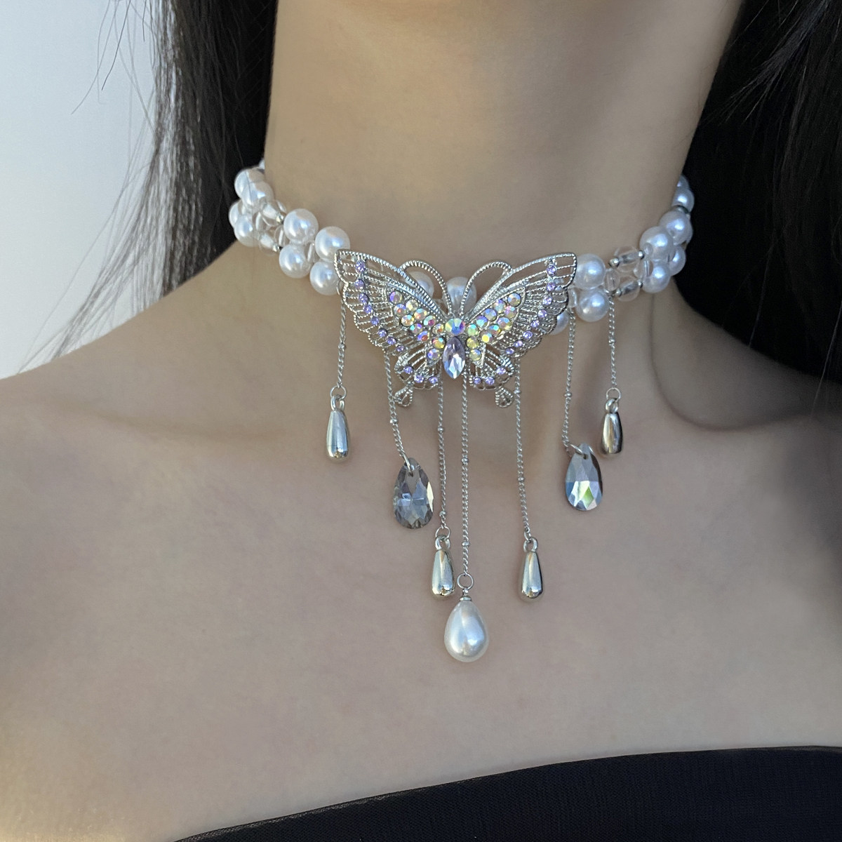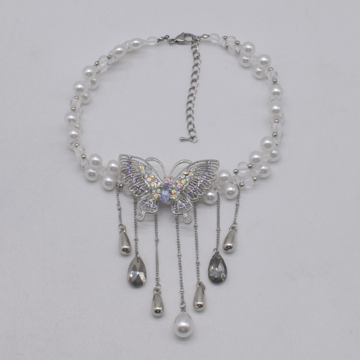 巴洛克双层珍珠水晶紫色蝴蝶项链女小众轻奢高级感流苏镶钻锁骨链