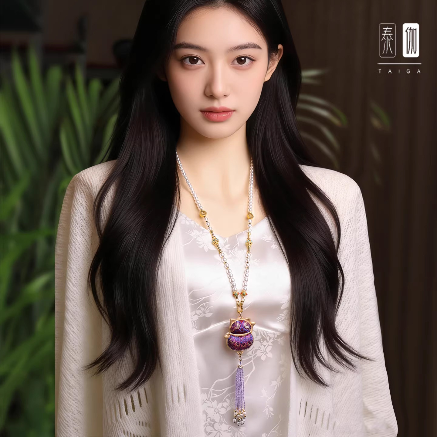宋锦项链紫色蝴蝶双面水晶流苏珍珠项链古风挂链汉服旗袍毛衣链