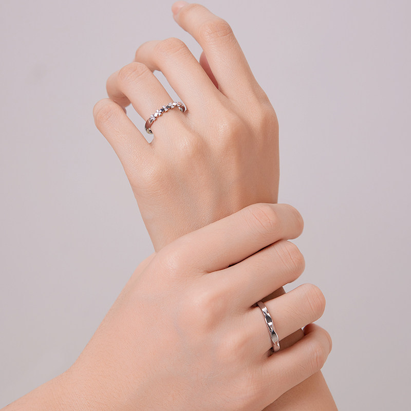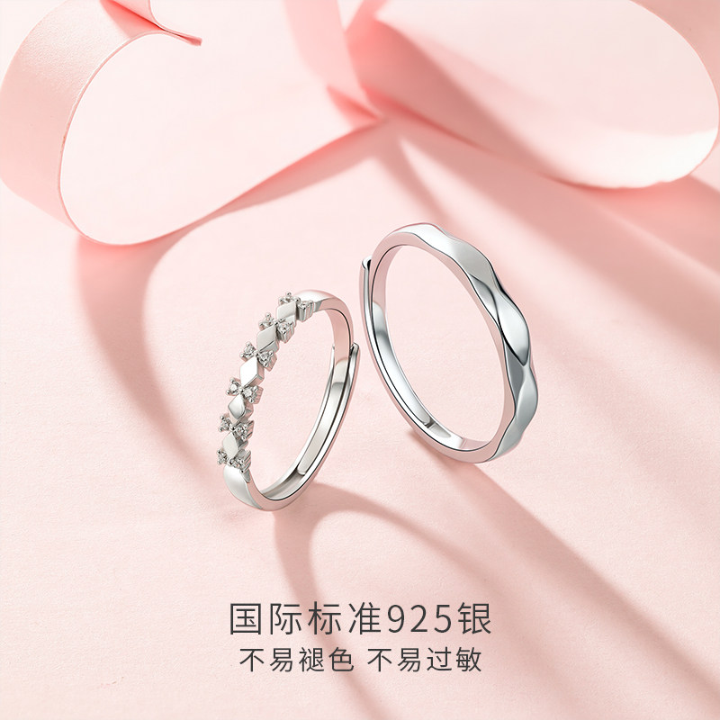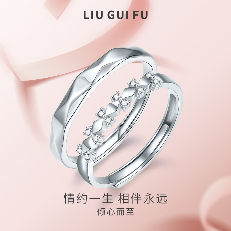 六桂福珠宝情约系列S925银戒指镶锆石情侣对戒小众时尚款银饰配饰