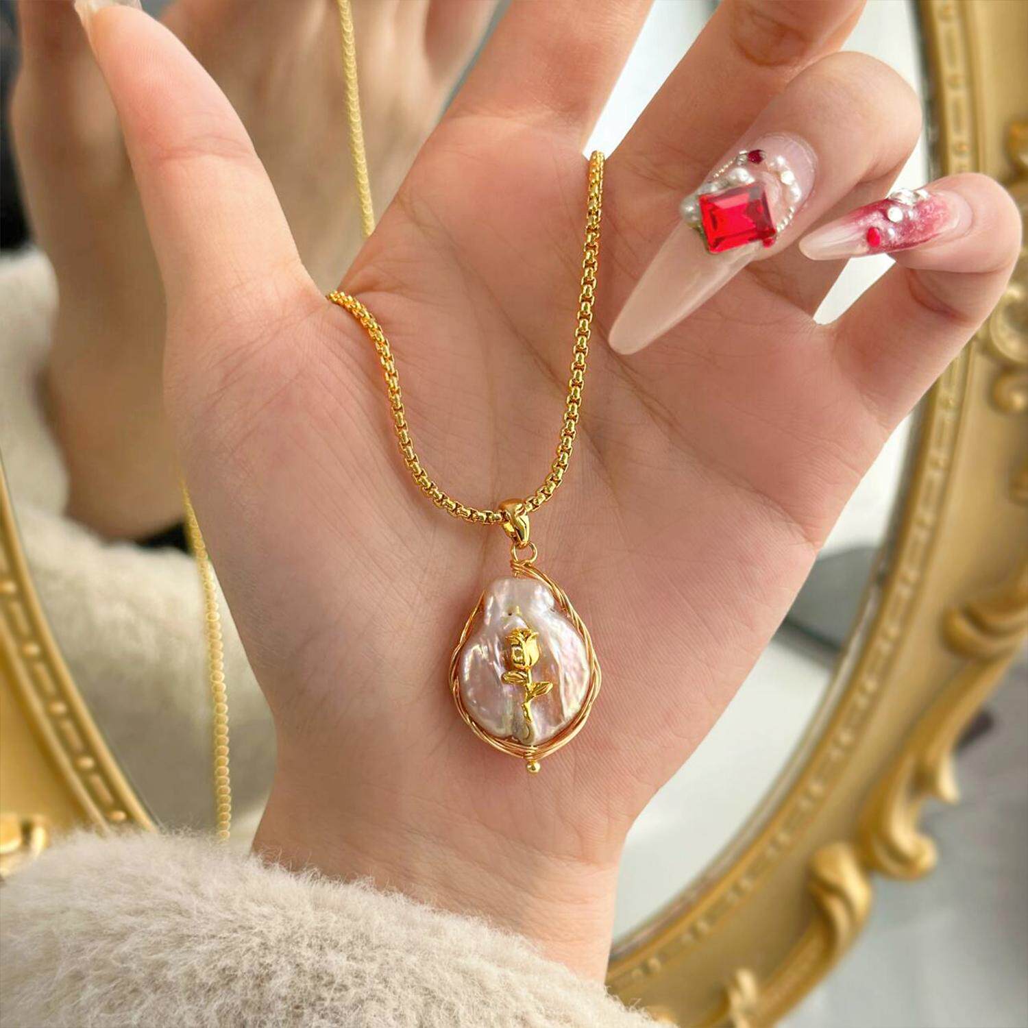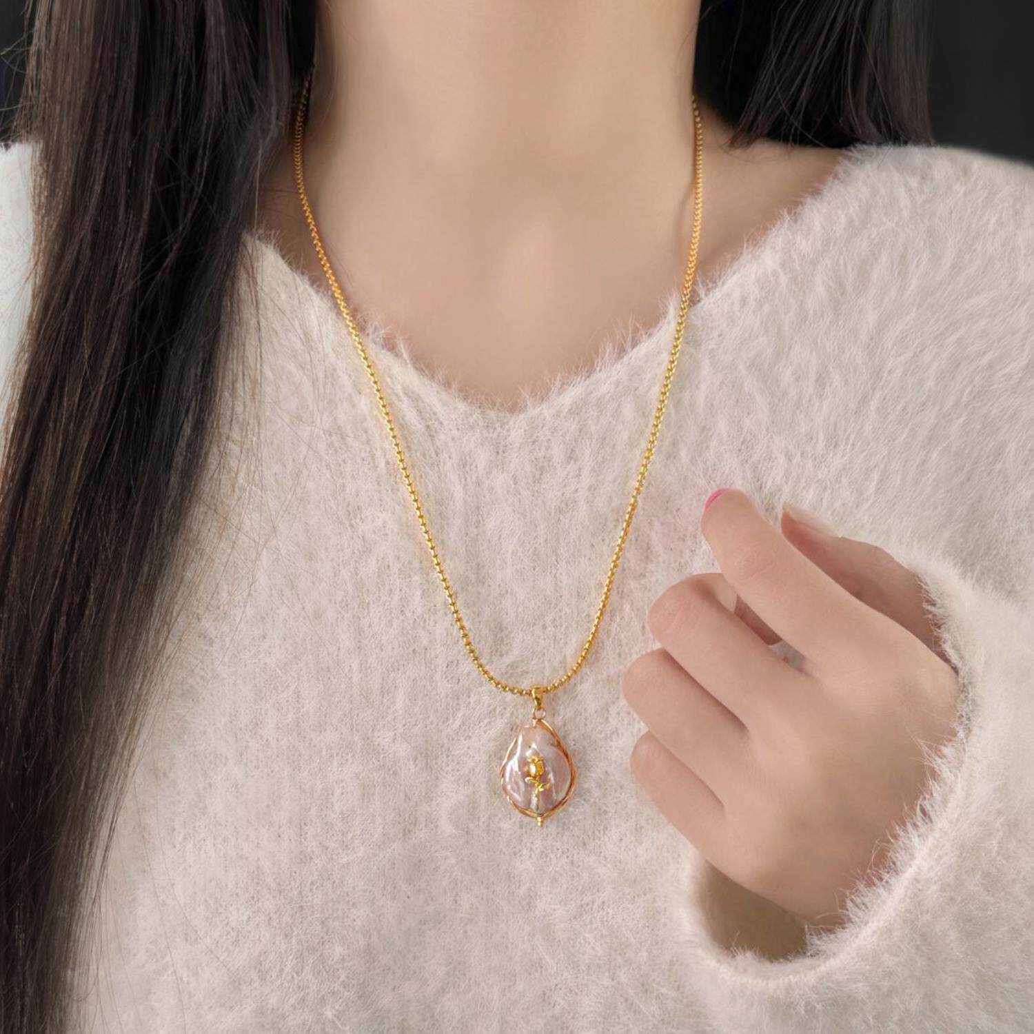 复古玫瑰花朵粉色巴洛克珍珠毛衣项链女秋冬毛衣链轻奢高级感颈链