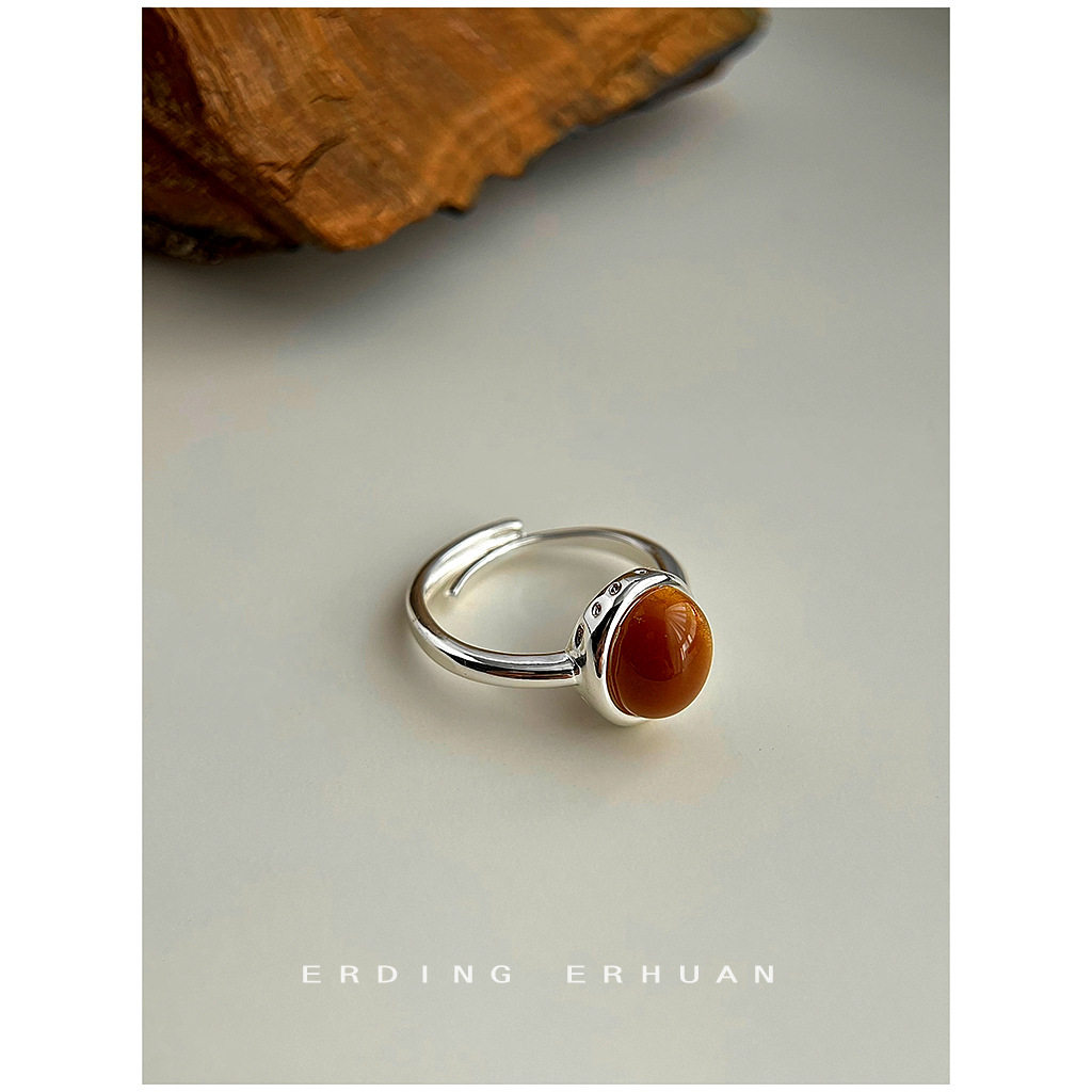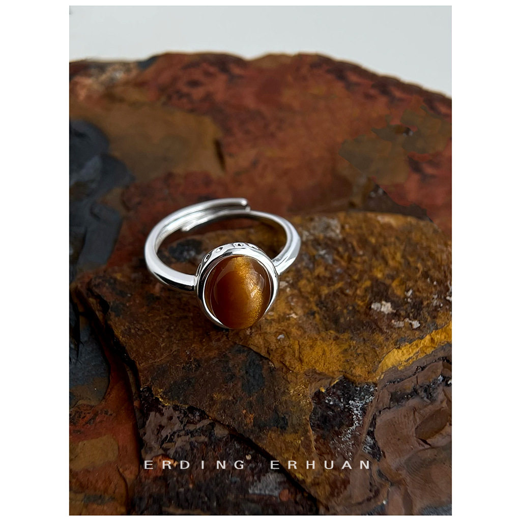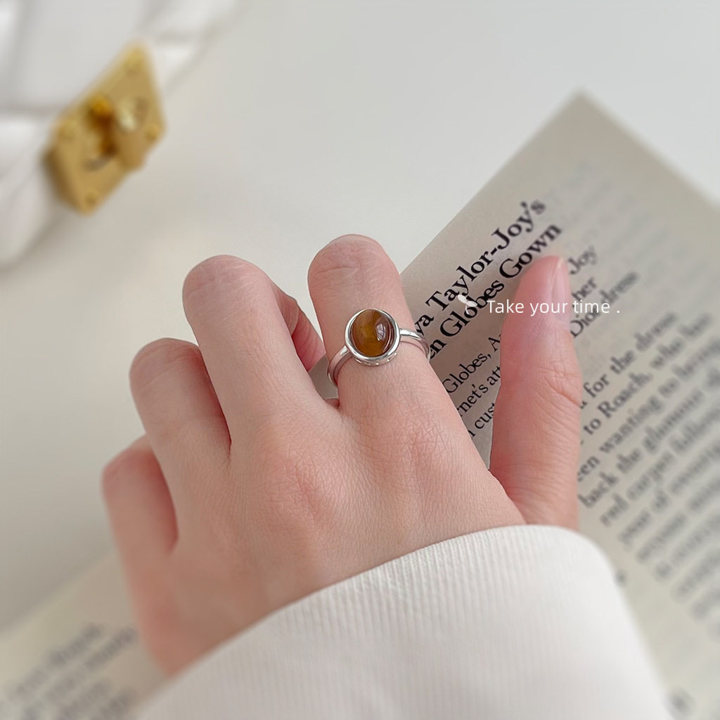 英系chrry koop文艺复古树脂虎眼石鹅蛋形戒指开口可调节指环