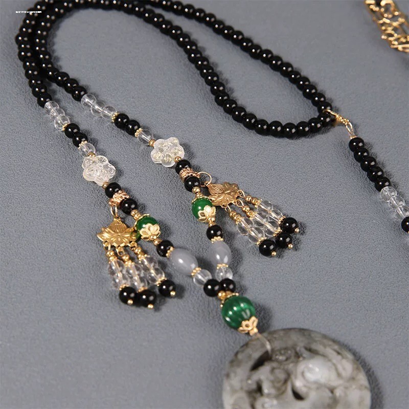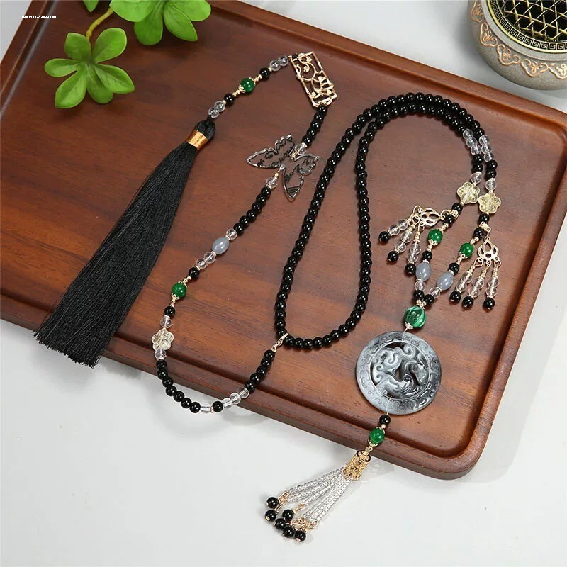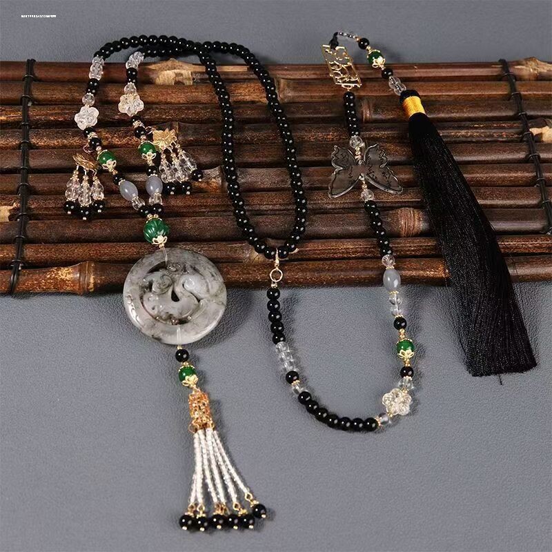 新中式国风黑色吊坠背云长流苏璎珞串珠项链古风汉服马面裙配饰品