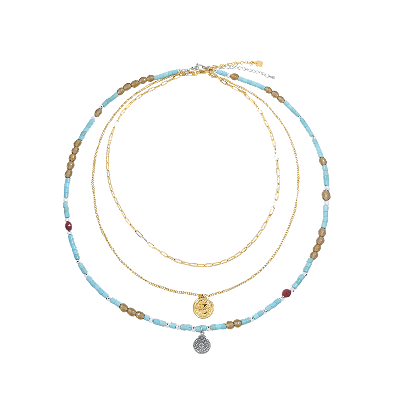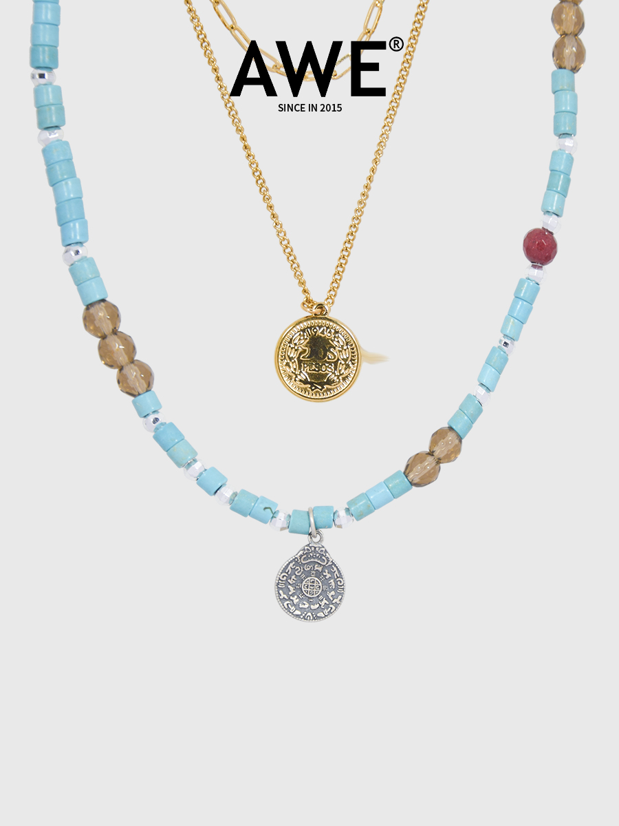 AWE绿松石复古硬币项链女生周雨彤赵昭仪同款三层叠戴颈链锁骨链