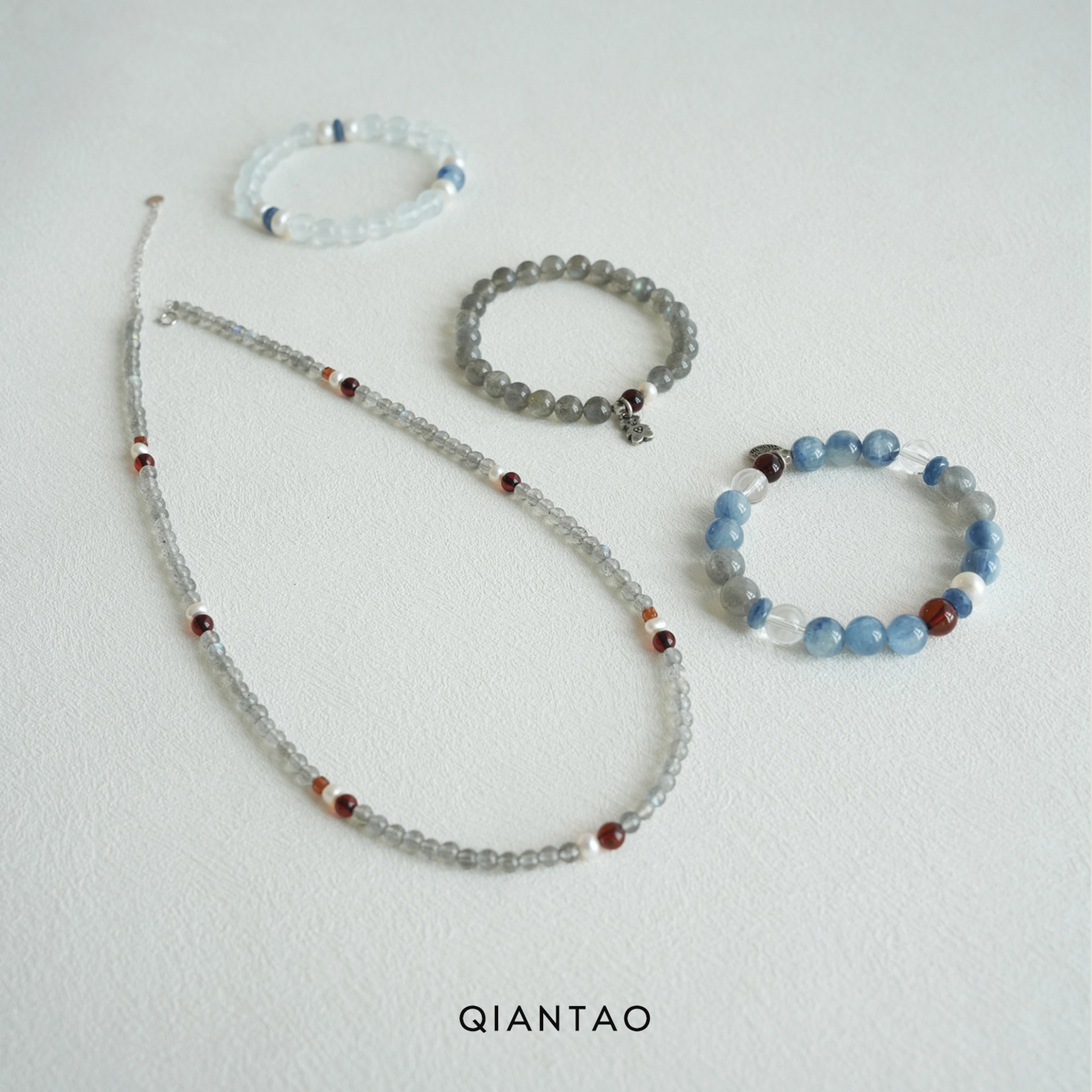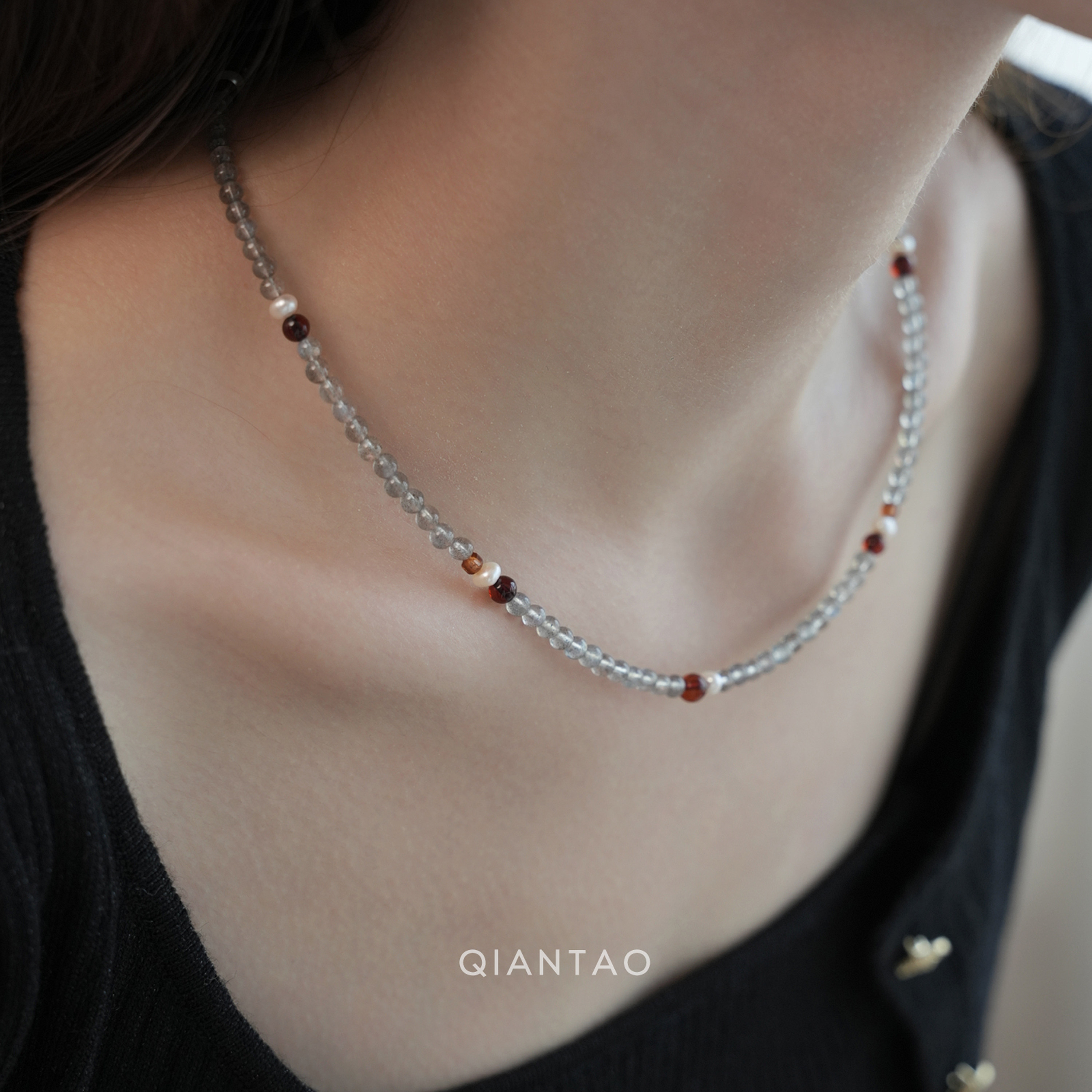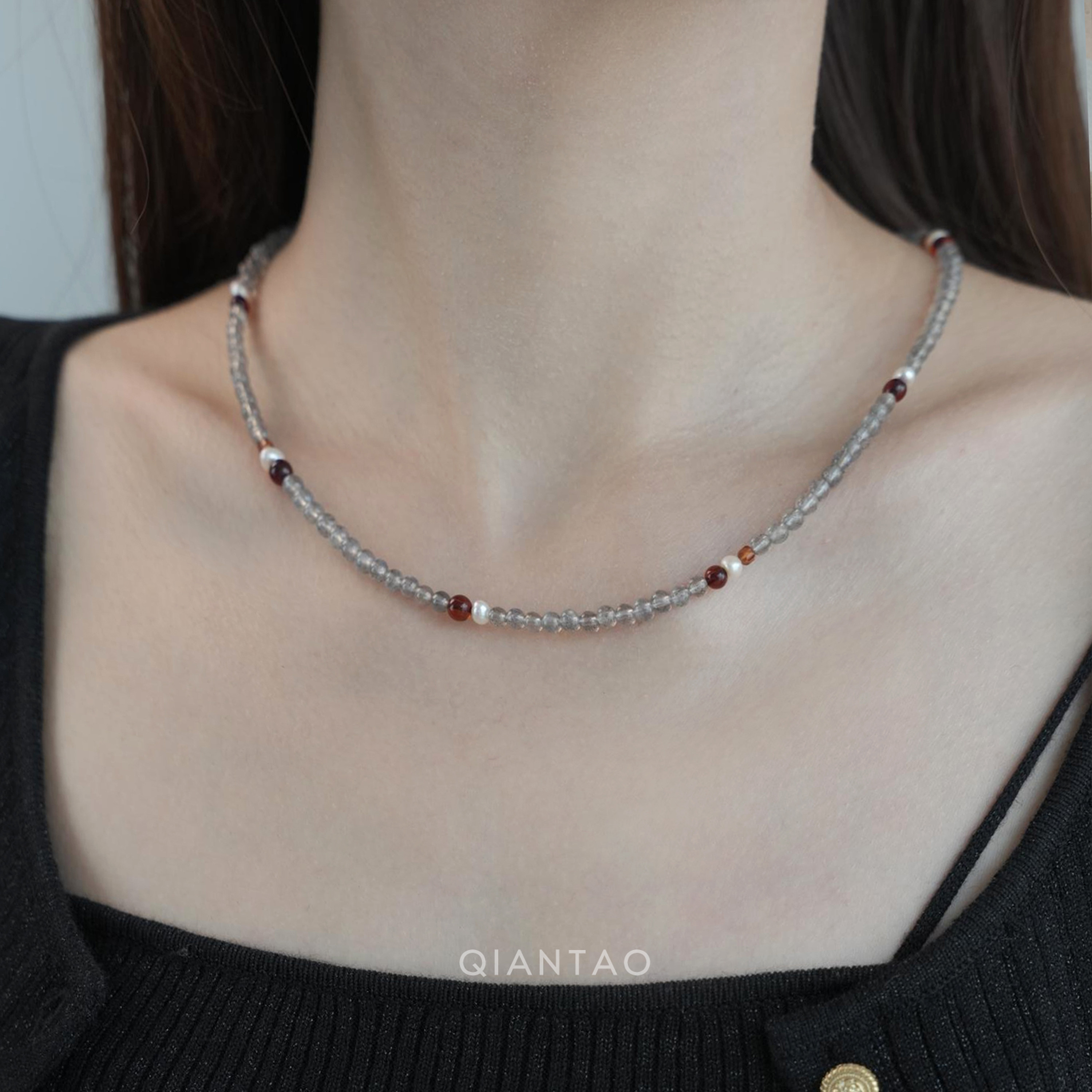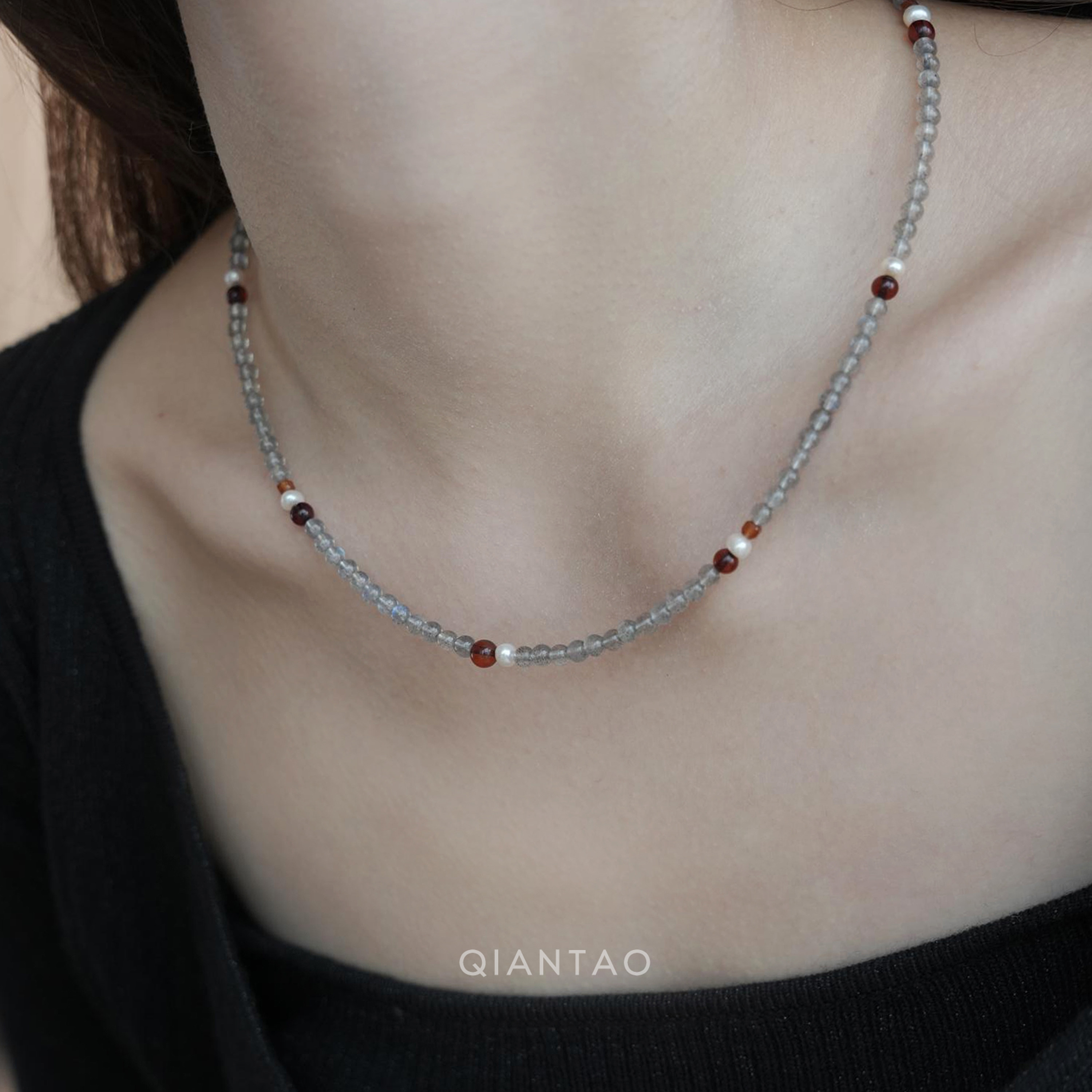 QIANTAO「晚莺」原创国风天然灰月光石项链淡水珍珠复古锁骨链女