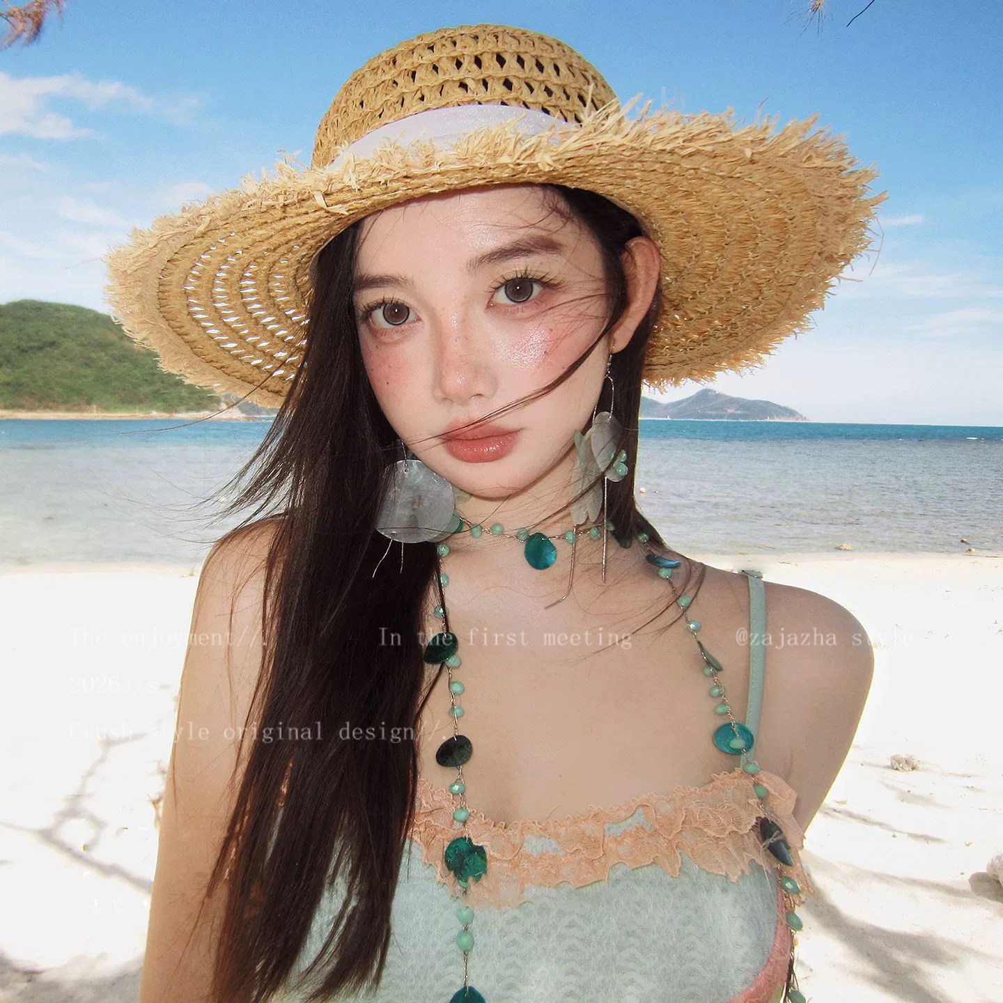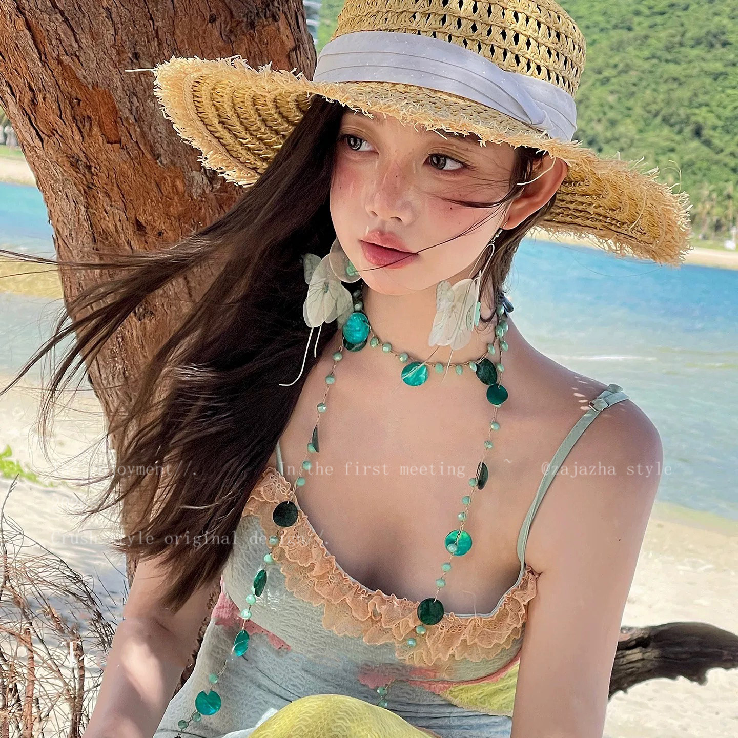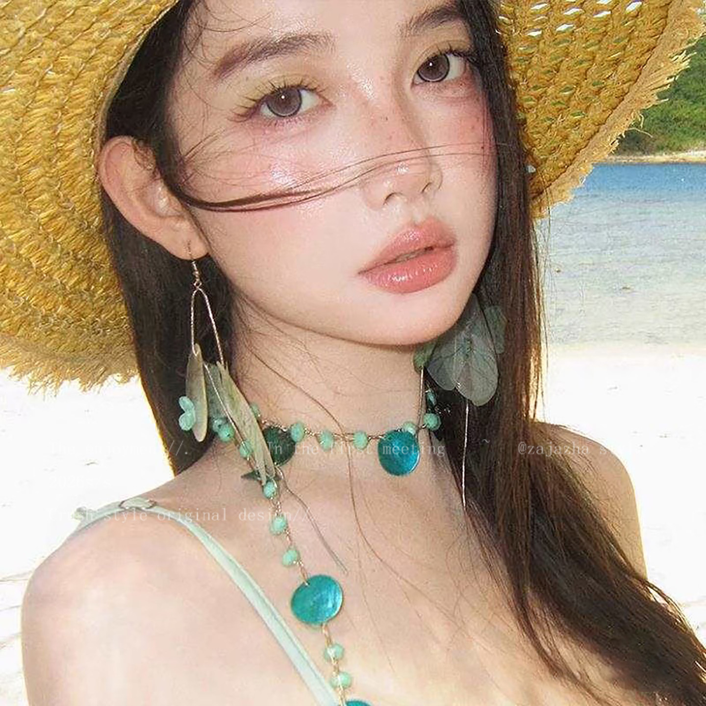 复古蓝绿色贝壳流苏项链女波西米亚民族风锁骨链海边度假长款配饰