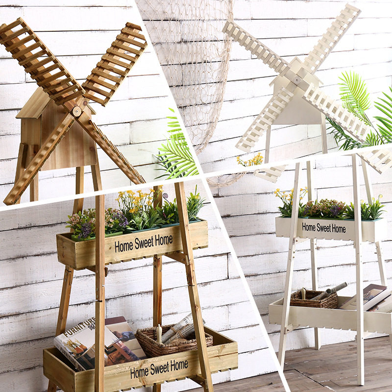 美式乡村做旧实木多层风车花架阳台置物架咖啡馆花店餐厅装饰创意